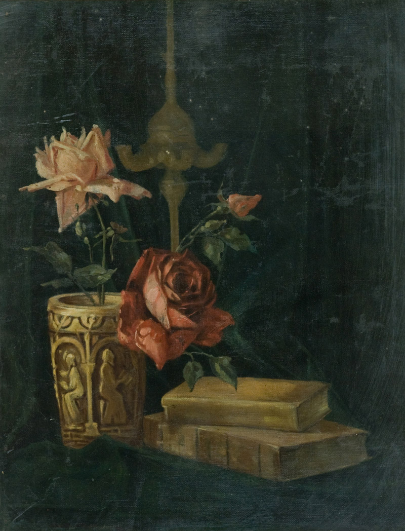 Anonimo dell'800 Natura morta Olio su tela applicata su cartone, cm. 61x48 La tela presenta lievi imperfezioni.