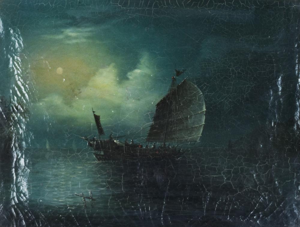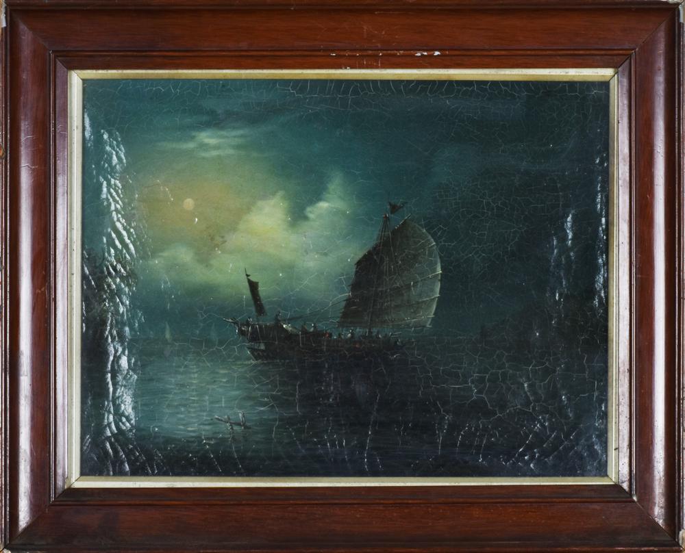 Scuola del XIX secolo NOTTURNO CON GIUNCA olio su tela, cm 23x30 diffuso...