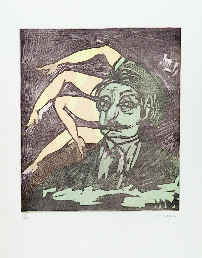 Mino Maccari Senza titolo Linoleografia di cm. 40x35, su carta di cm. 60x46, es. 19/65 Firma in basso a destra, tiratura in basso a sinistra.