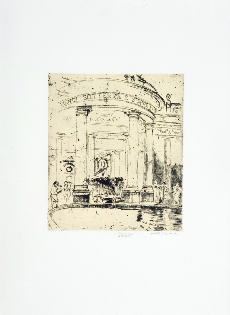 Walter Piacesi Rotonda della Fonte del Tettuccio, Montecatini Terme, 1980 Acquaforte di cm. 33x29, su carta di cm. 70x50, es. 77/120 Firma in basso a destra, tiratura in basso al centro.