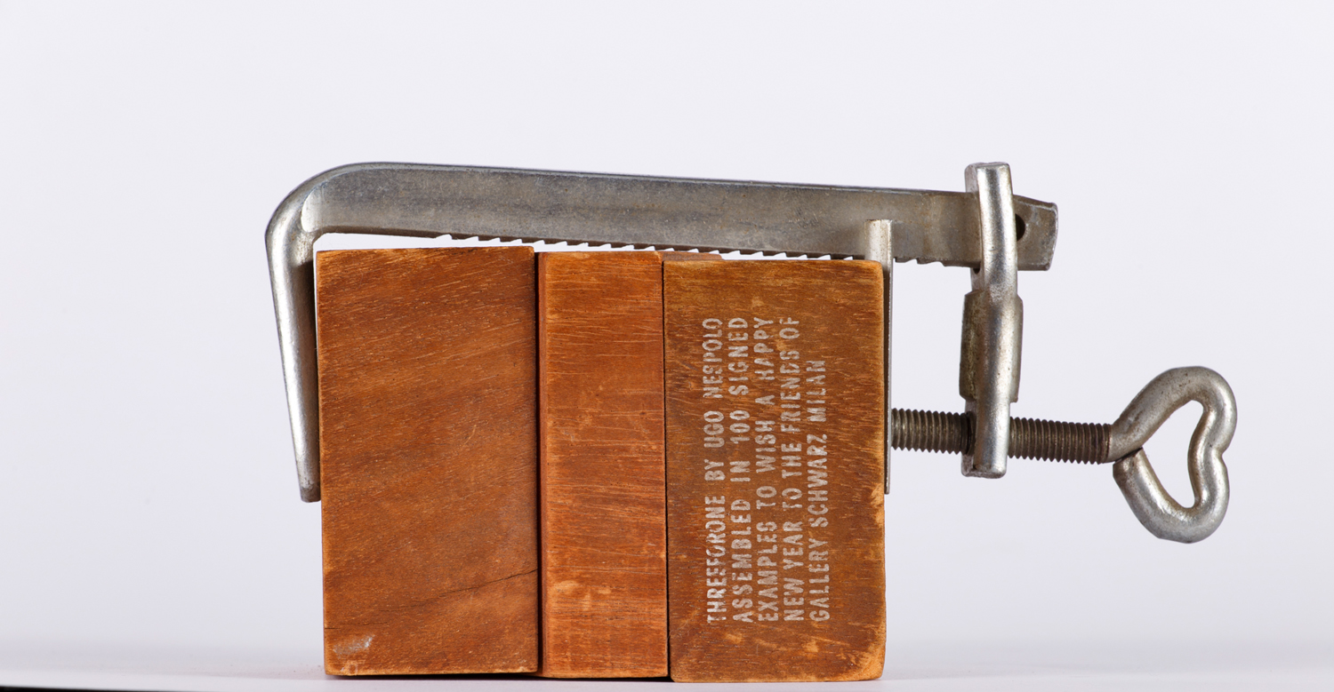 Iscrizione "Triperuno di Ugo Nespolo eseguito in 100 esemplari firmati per augurare buon anno agli amici della Galleria Schwarz Milano"