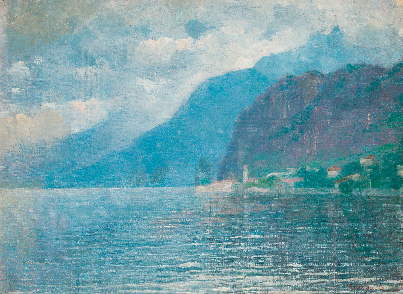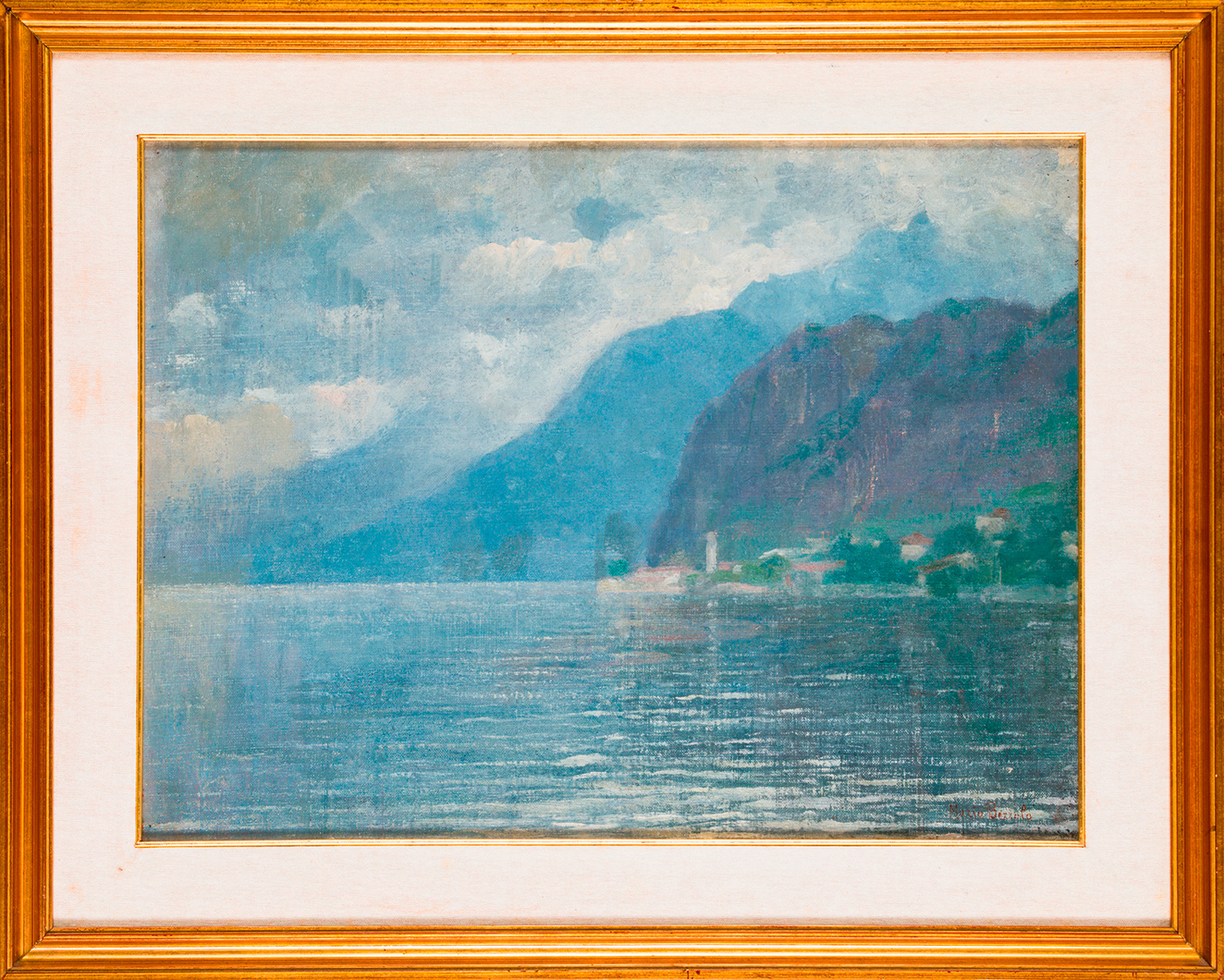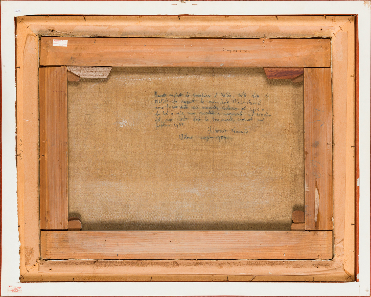 Iscrizione del figlio dell'Artista al retro recante la seguente dicitura: 'Questa veduta di Campione d'Italia dalla diga di Melide fu eseguita da mio padre Mario Bezzola anno prima della mia nascita, intorno al 1910 e fu poi a mia cura montata e incorniciata nel riordino del suo studio dopo la sua morte, avvenuta nel febbraio 1968. Antonio Bezzola. Milano. Maggio 1984'