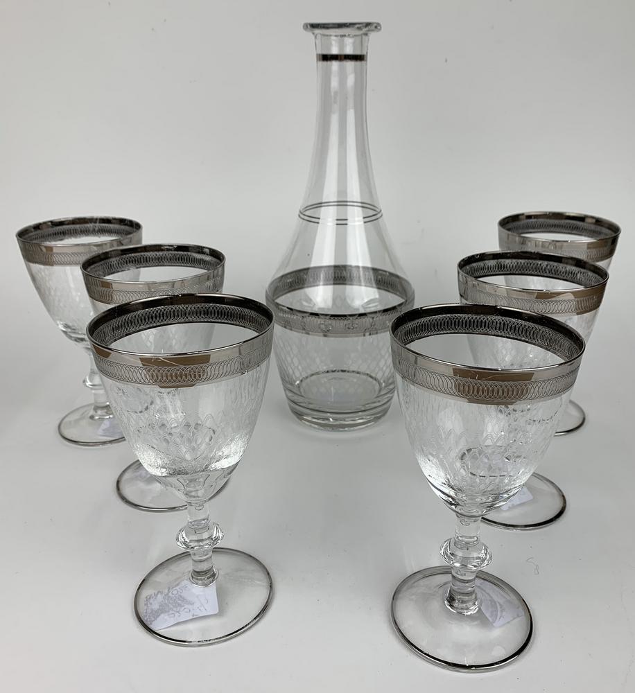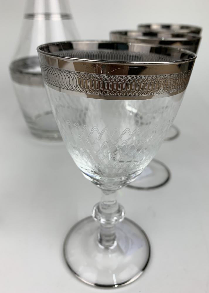 servizio finemente inciso con decorazione color argento e bottiglia abbinata (manca il tappo)