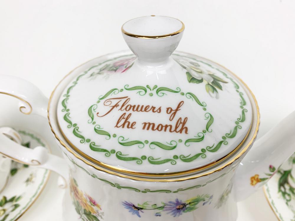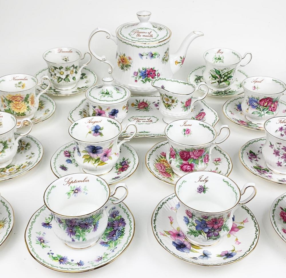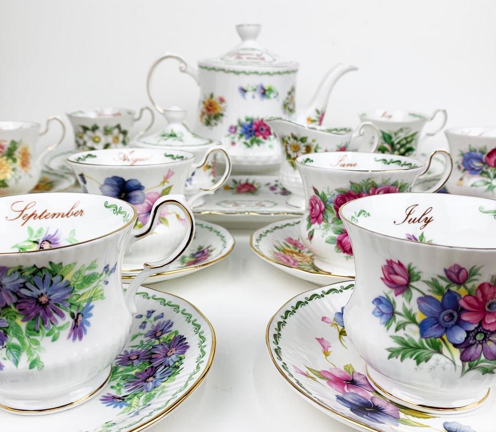 serie 'Flowers of the Month' composto da teiera, lattiera, zuccheriera, vassoietto e 12 tazze con piattino ciascuna decorata con differenti soggetti floreali, uno per ogni mese dell?anno Inghilterra, anni '80