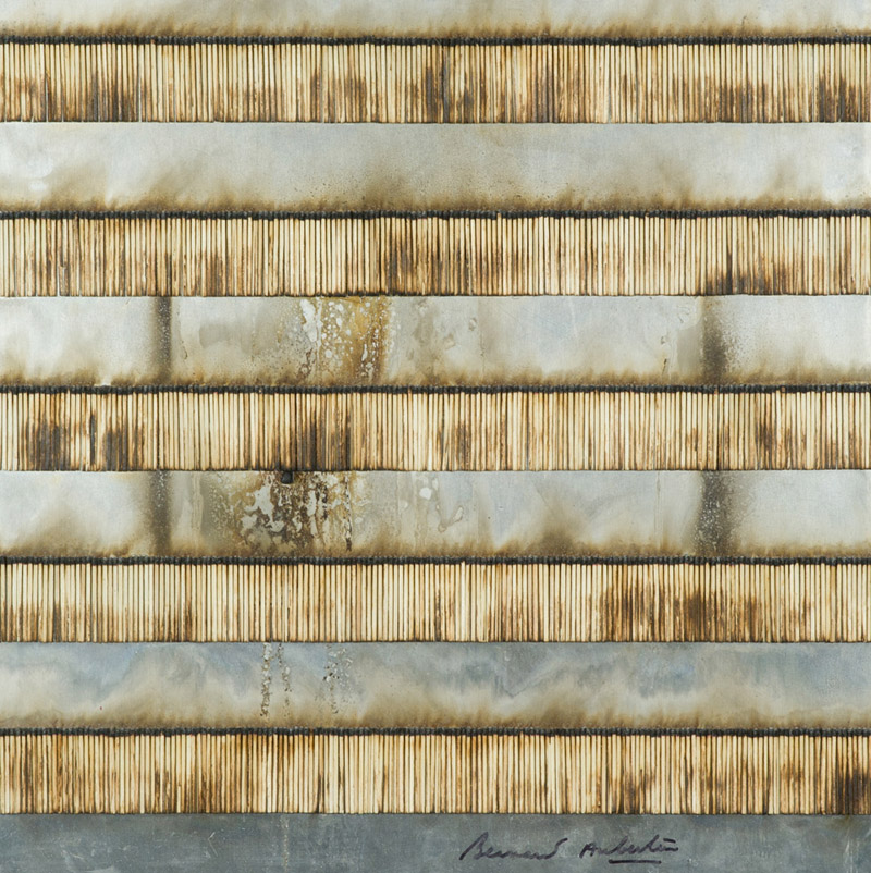 Bernard Aubertin Senza titolo Fiammiferi bruciati su lastra di metallo, cm. 50x50, in teca di plexiglas Firmato in basso a destra. Autentica dell'Artista su foto.