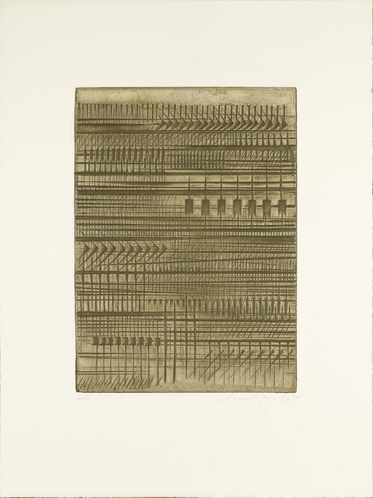 POMODORO ARNALDO (n. 1926). Senza titolo.. 82/100. Tiratura e firma a matita in basso. Dimensione lastra: 35.5x25 cm.. Calcografia. Cm 42,50 x 57,00.
