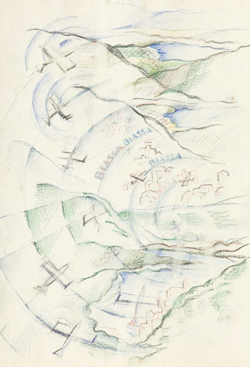 Uberto Bonetti Veduta panoramica aereo futurista Pastelli policromi su carta,...