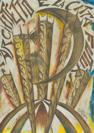 Riccardo Magni L'architetto e la città futurista Tecnica mista su carta, cm....