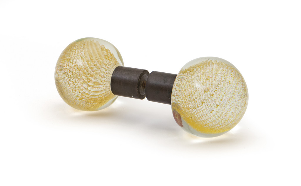 Una coppia di maniglie in cristallo sommerso con foglia d'oro e ottone.