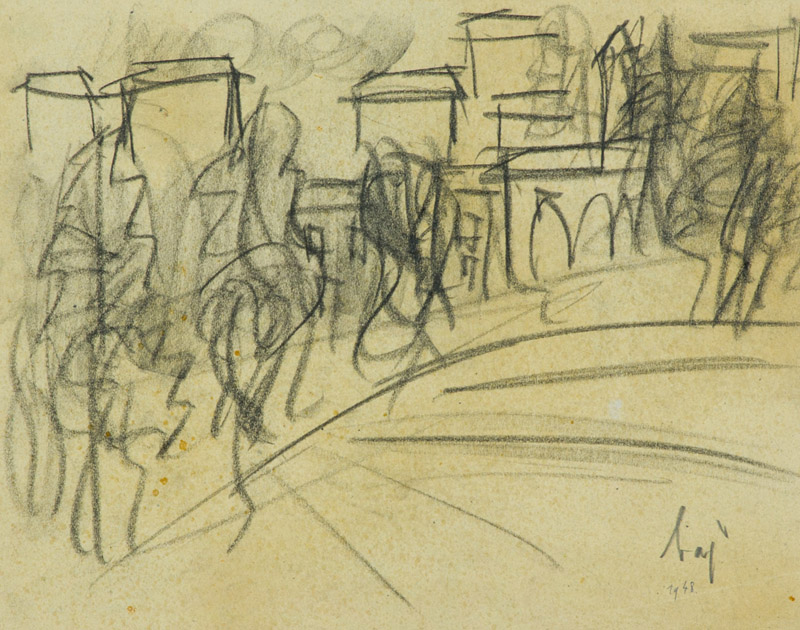 Enrico Baj Paesaggio, 1948 Carboncino su carta, cm. 24,5x32 La carta presenta lievi imperfezioni dovute al tempo. Firma e data in basso a destra. Sul verso: altro disegno. Autentica dell'Artista su foto.