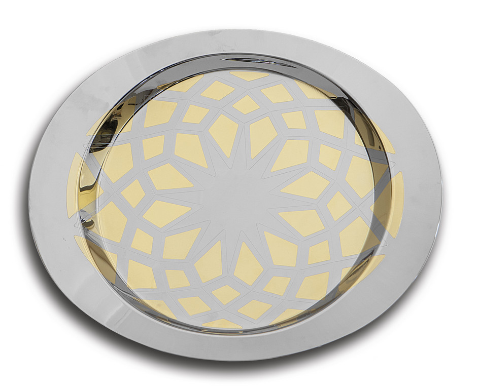 Acciaio inossidabile decorato con incisione meccanica e doratura galvanica. Marchio stampigliato 'Officina Alessi 1985 Italy'.