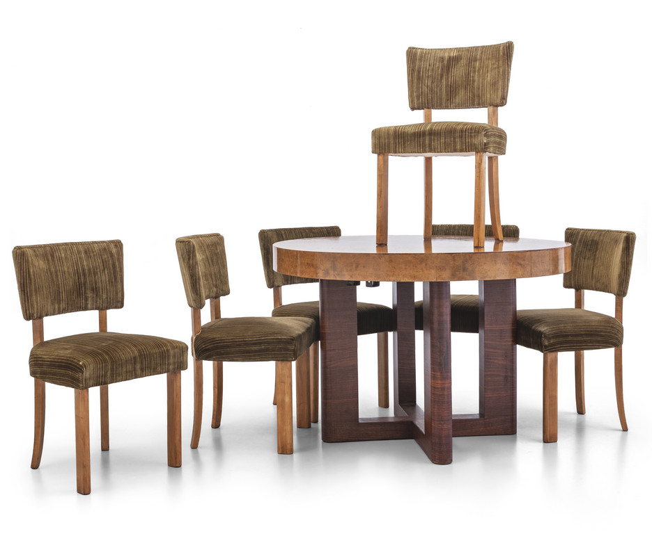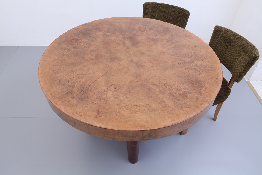 Tavolo (supporto di legno impiallacciato in palissandro piano impiallacciato in radica): altezza cm 79 diametro cm 120;