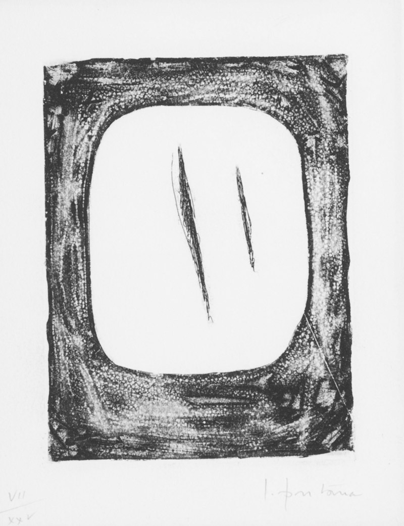 Lucio Fontana Concetto spaziale Acquaforte di cm. 14,7x11, su carta di cm. 24,8x20,5, es. VII/XXV Firma in basso a destra, tiratura in basso a sinistra. Bibliografia: Harry Ruhè, Camillo Rigo, "Lucio Fontana, incisioni, grafica, multipli, pubblicazioni...", Revendito Edizioni, pag. 26.
