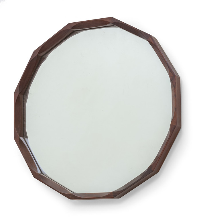 Uno specchio 'Cristallux' con cornice in palissandro a 12 lati sagomati anni '60.