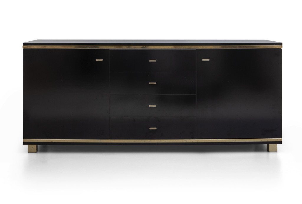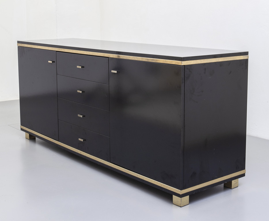 Legno rivestito in laminato con profili e maniglie di ottone nichelato.
