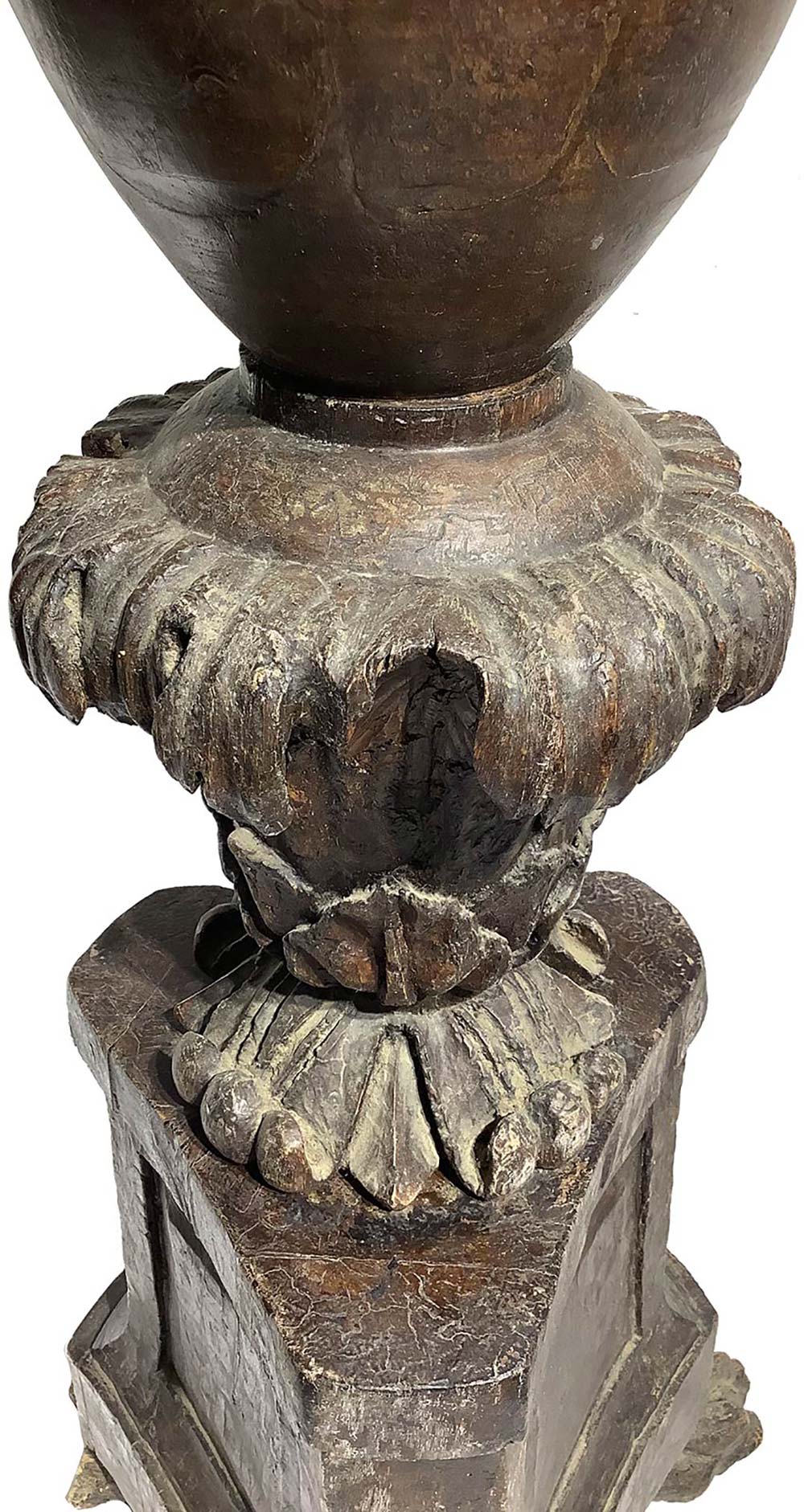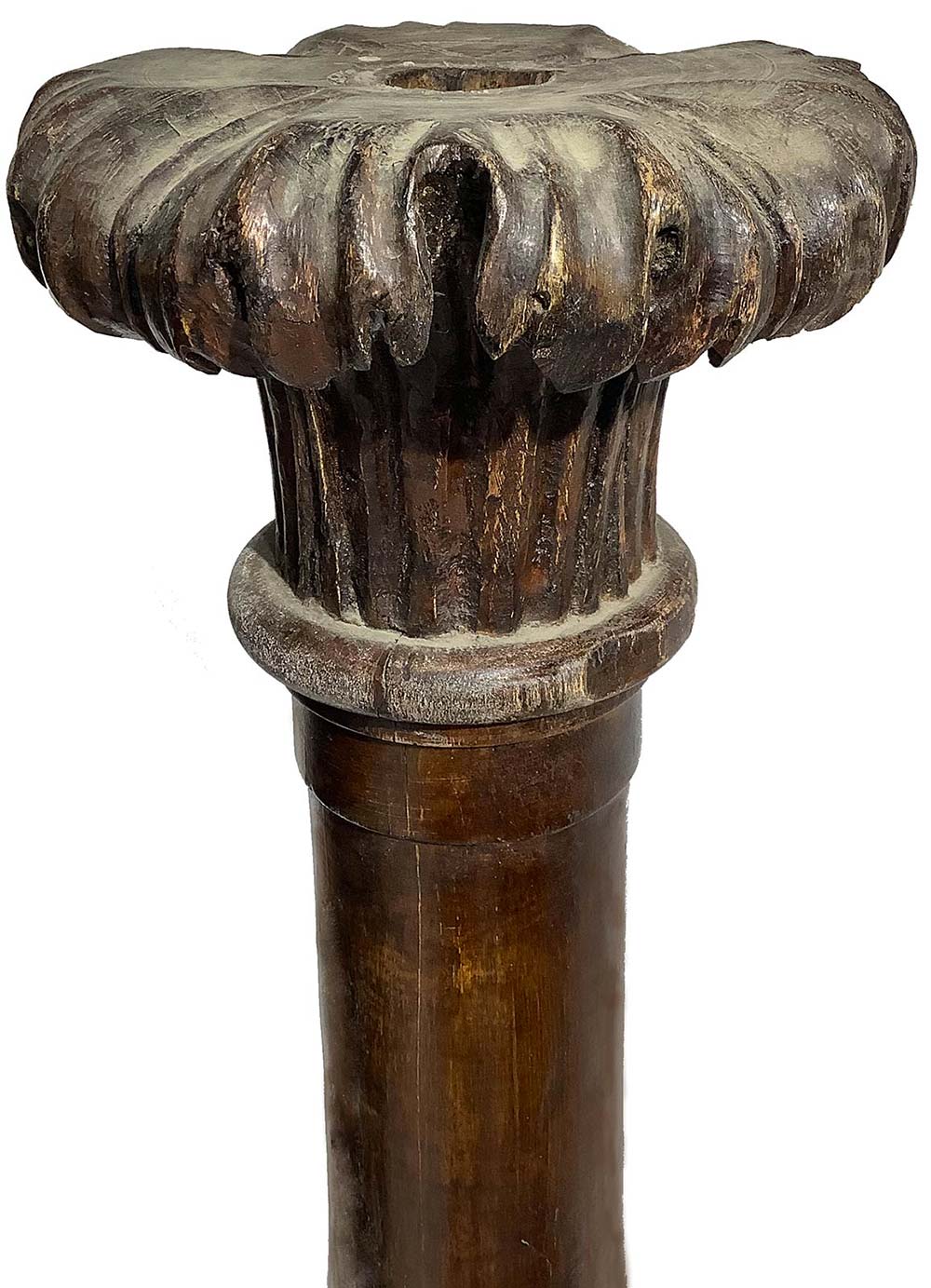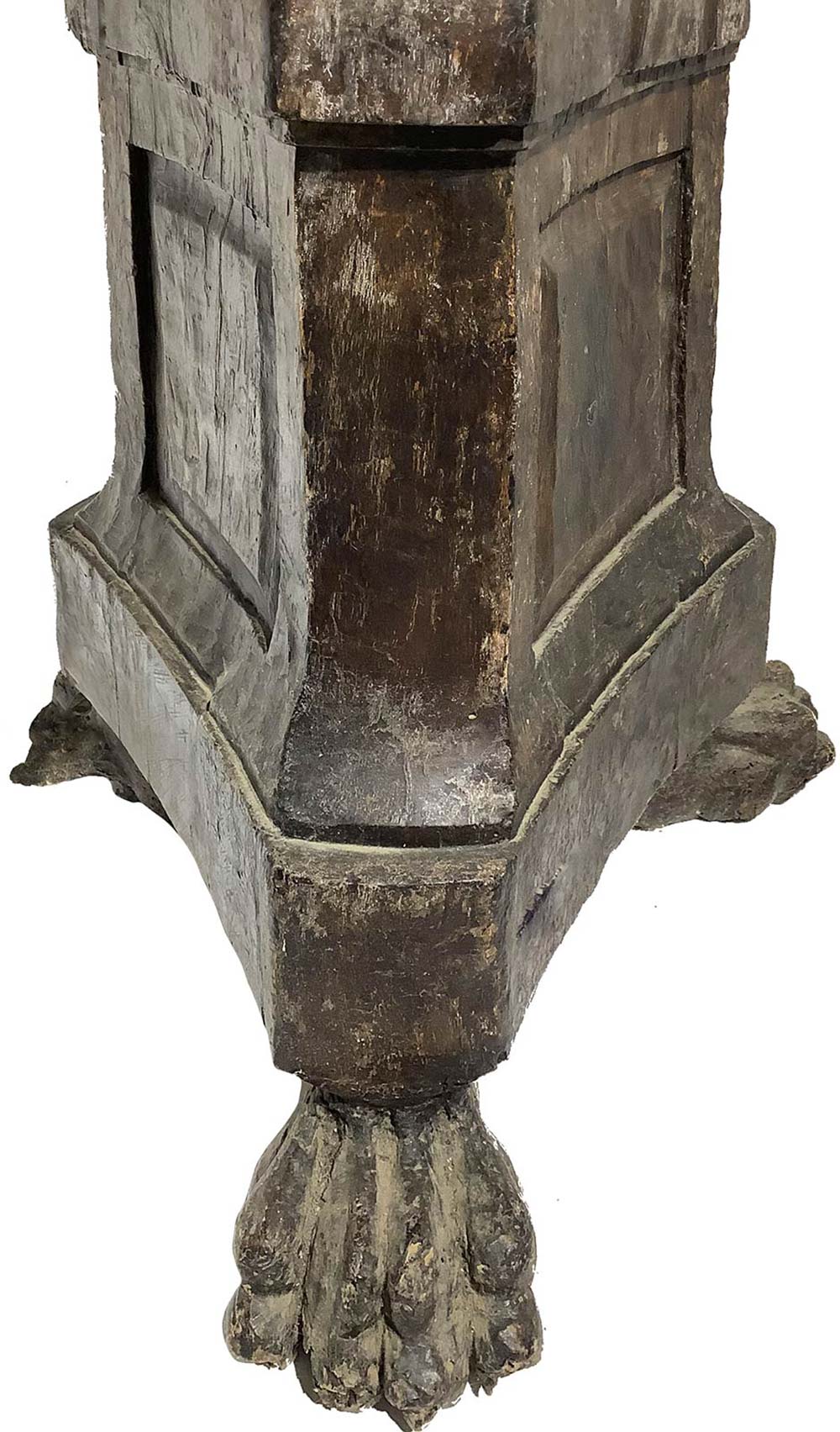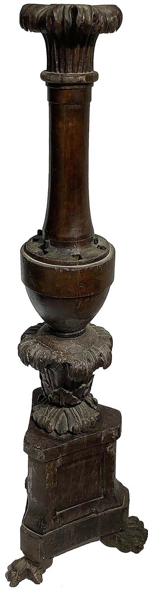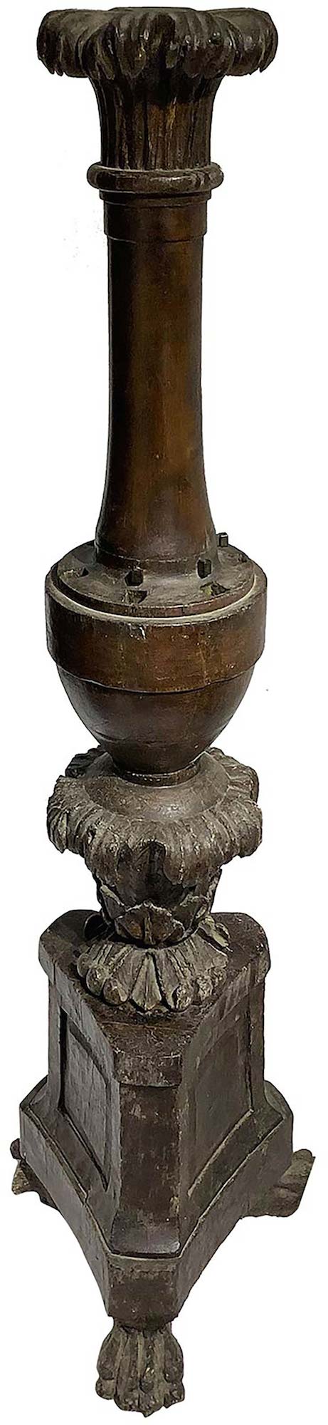 Candeliere in legno color noce, base a tre zampe leonine, XVIII secolo. H Cm 161.