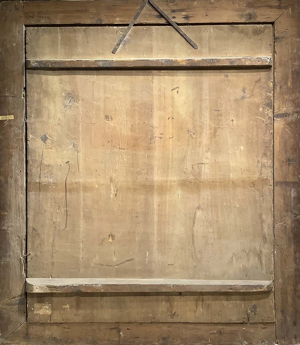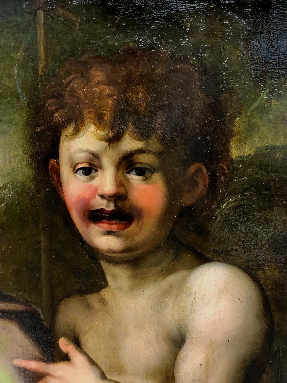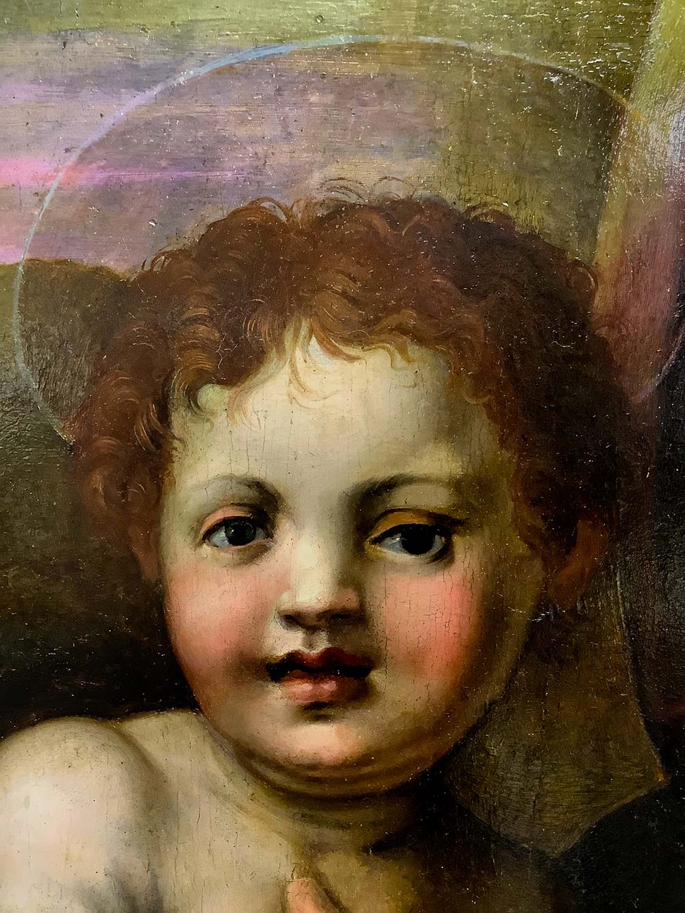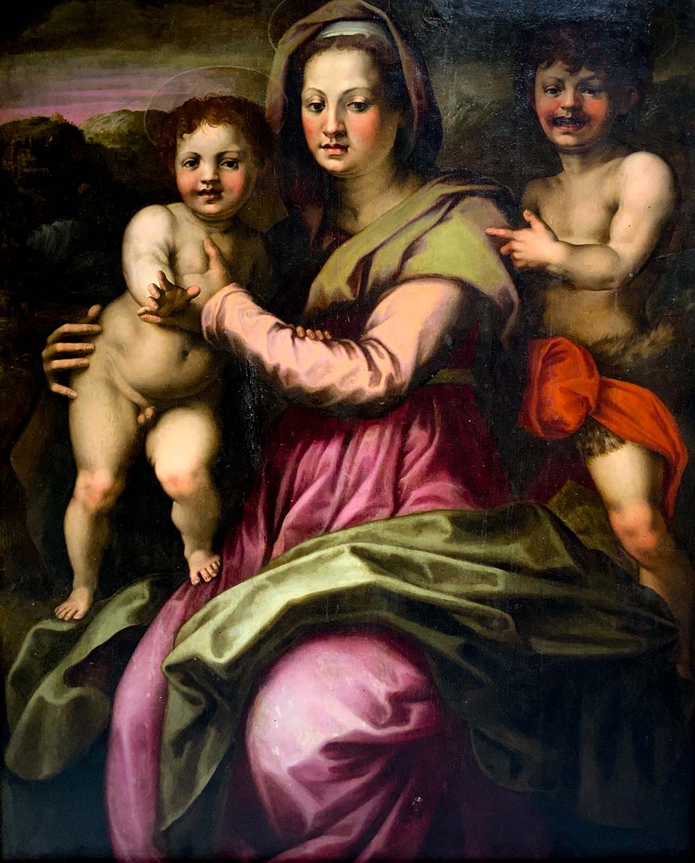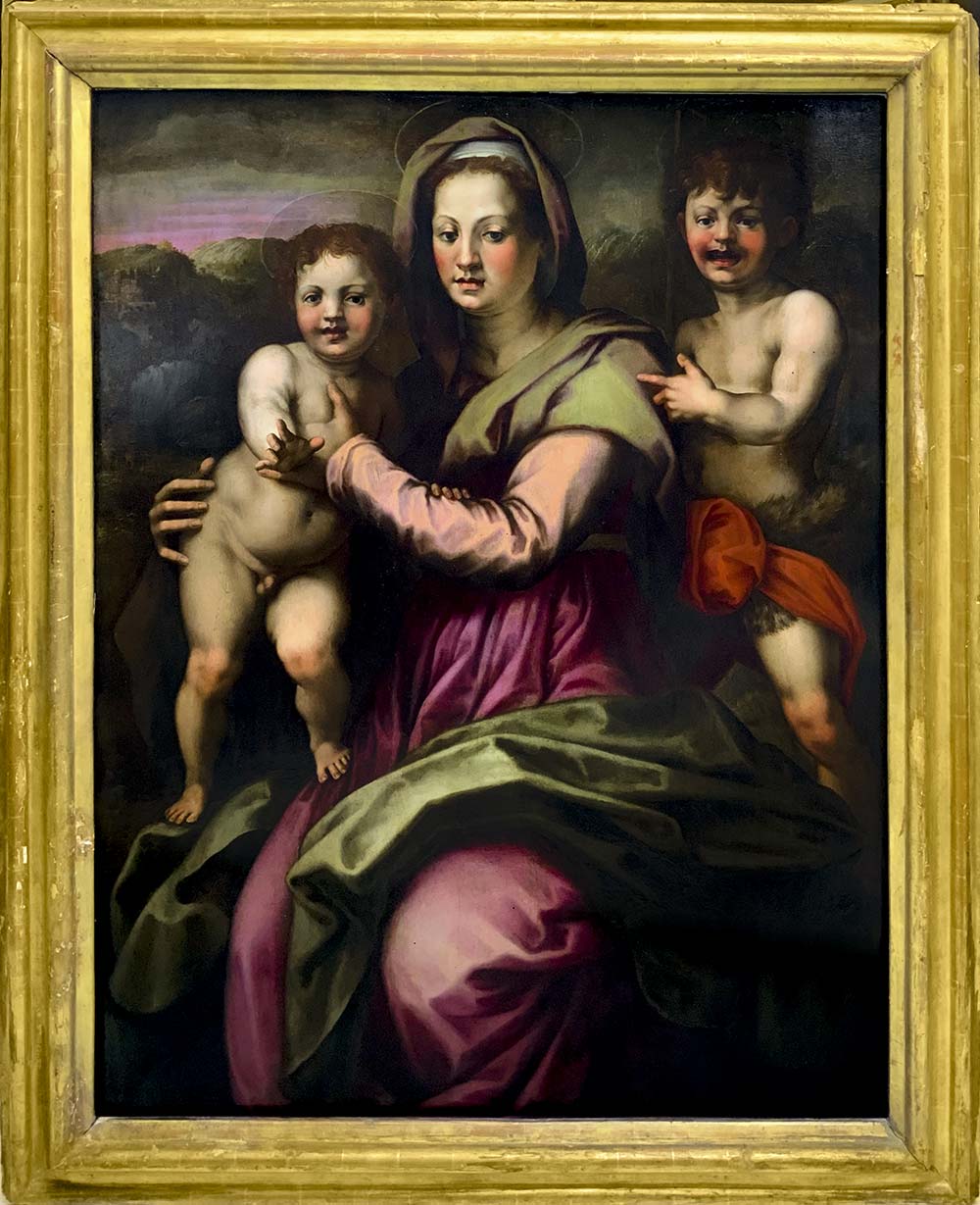 Pittore italiano del XVI secolo, cerchia Andrea Del Sarto. Madonna con Bambino e San Giovannino. 145x110, olio su tavola cm 2,50. Cornice in legno dorato. Ottimo stato di conservazione. Misure comprese di cornice 170 x 135