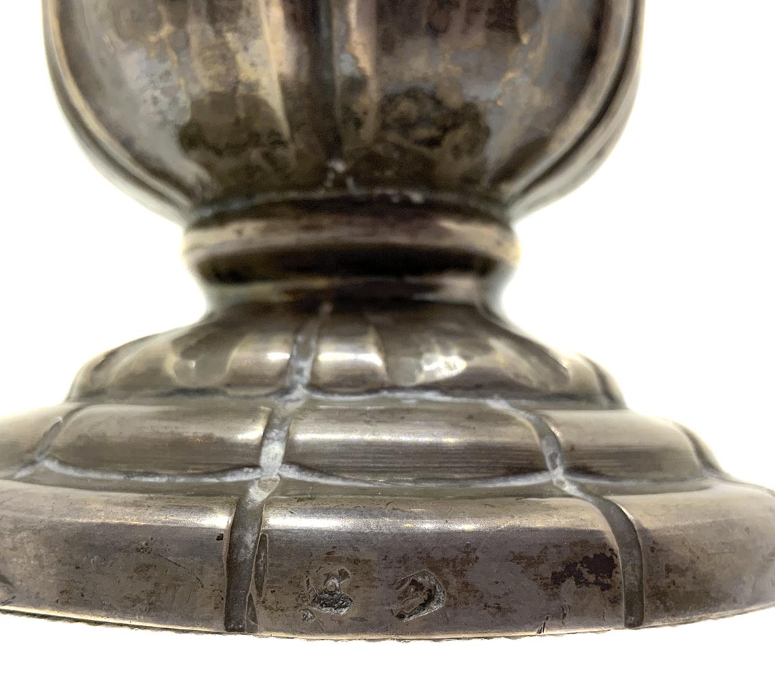 Vaso in argento ribattuto a mano. Probabilmente Sicilia, XVII secolo. Punzoni sul bordo della base. H cm 23, base cm 11.