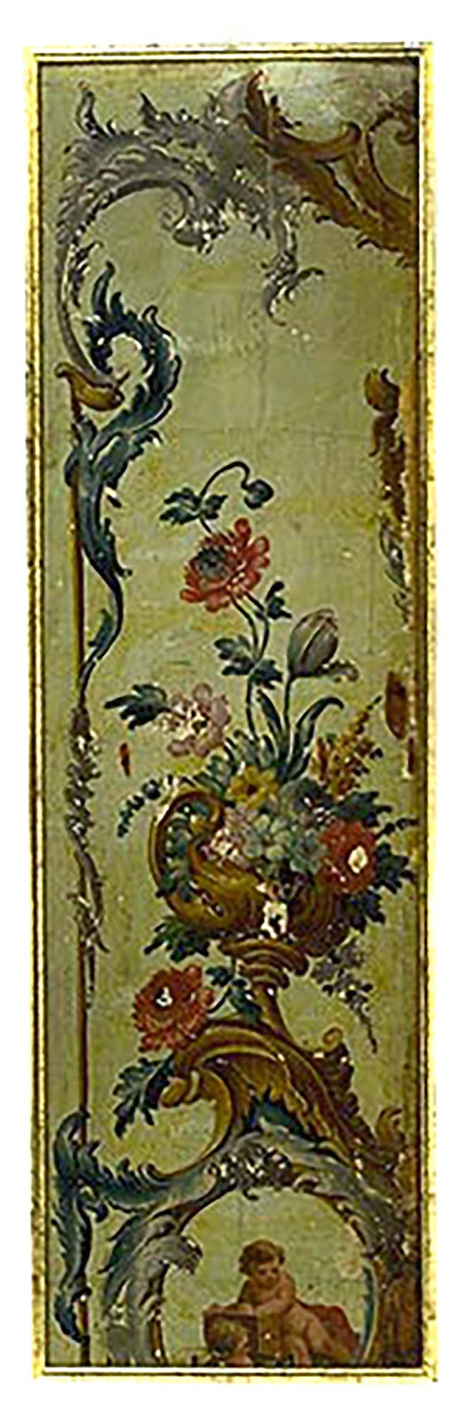 Pannello ligneo dipinto a motivi floreali , XVIII Secolo. Cm 121x 35, Cadute...