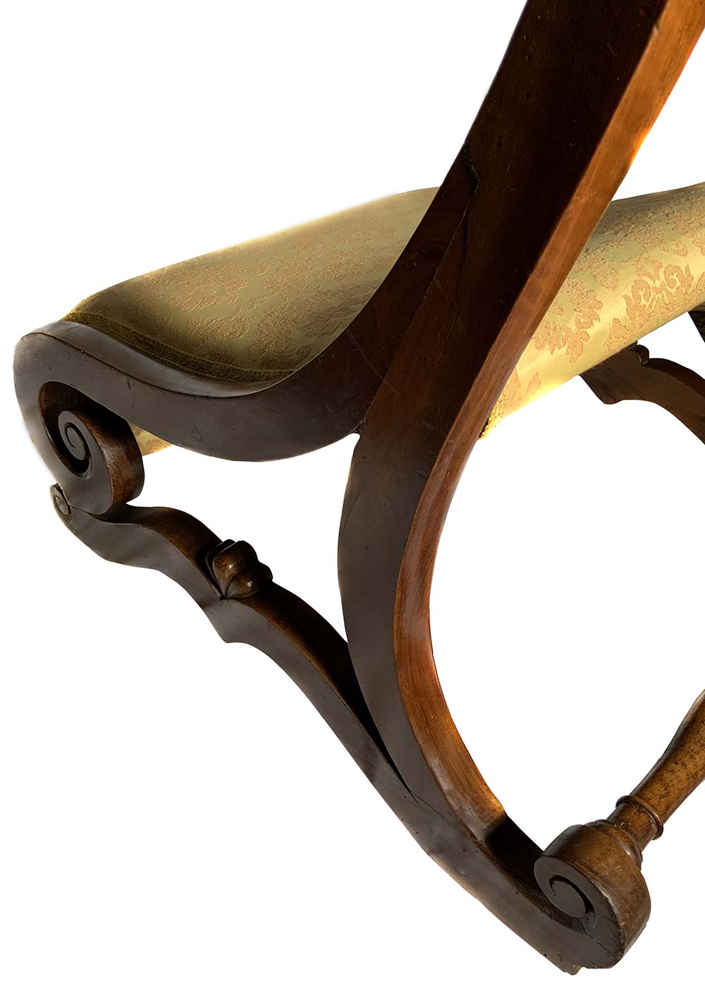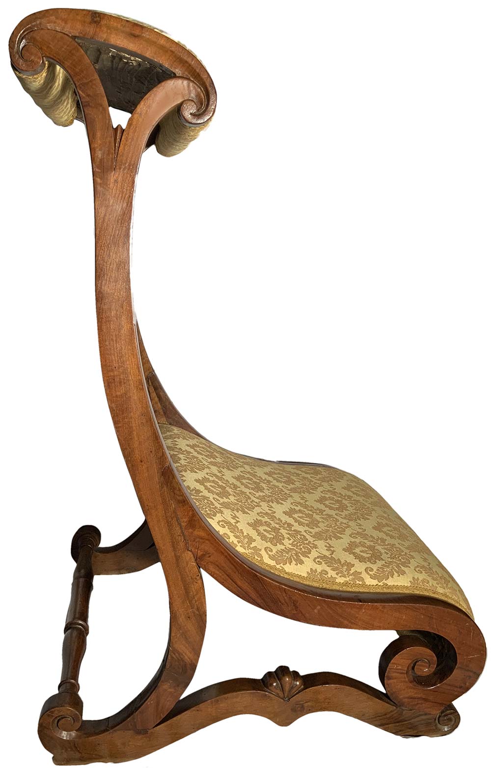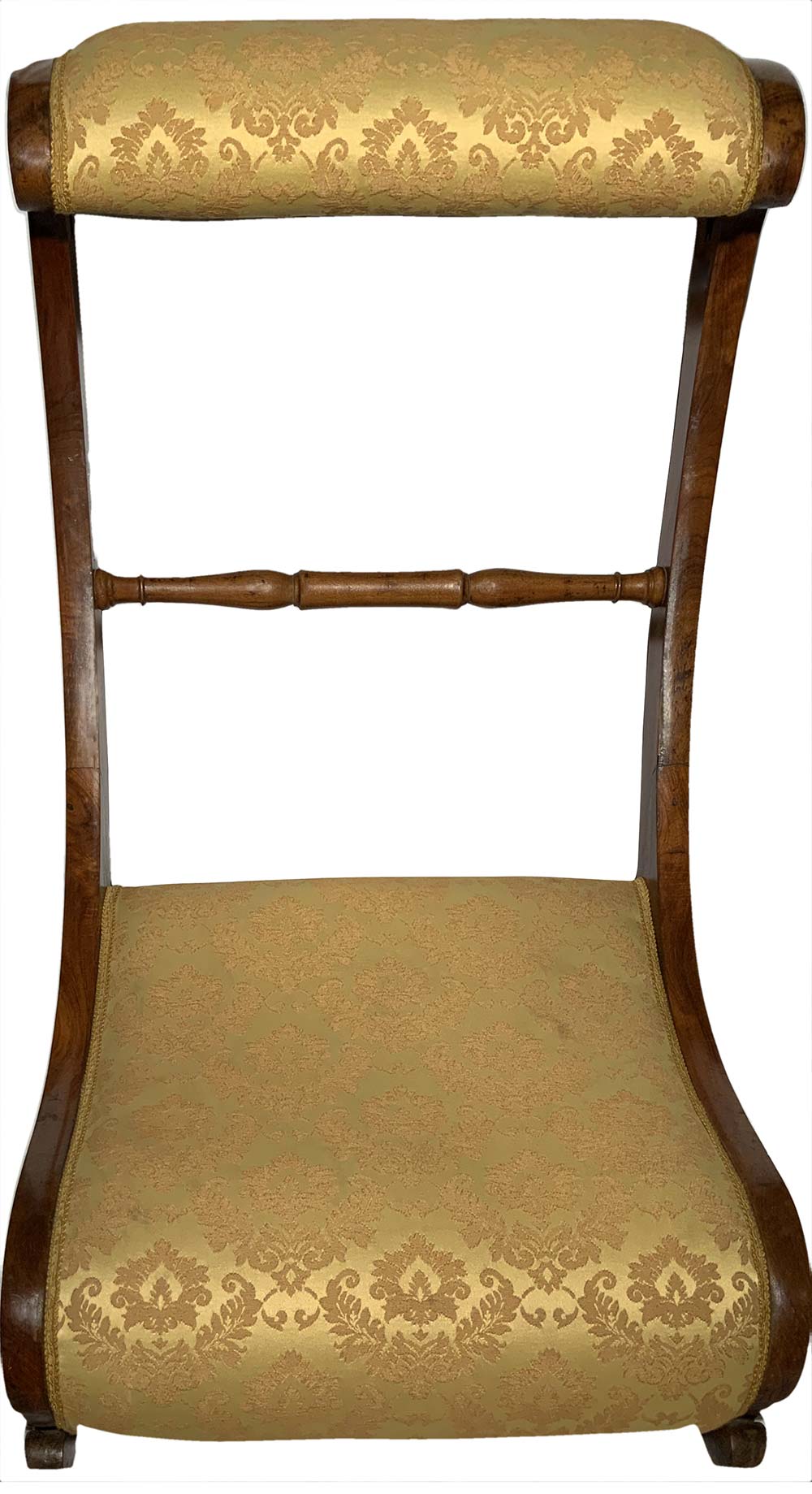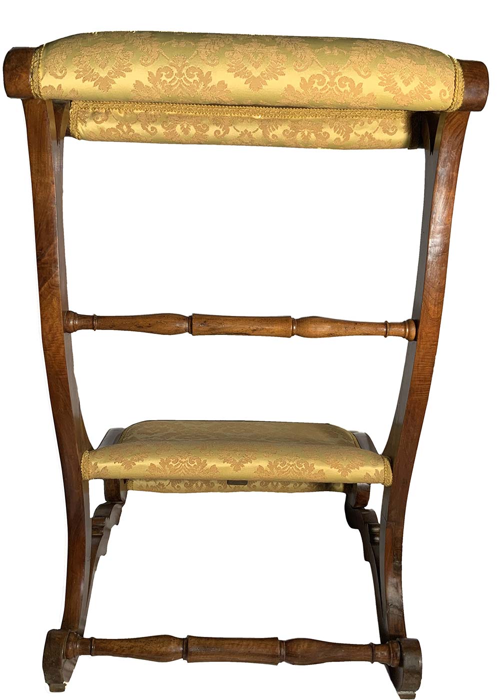 Inginocchiatoio, XIX secolo. Con tapezzeria damascata gialla, in legno di noce. H cm 85x53x58.