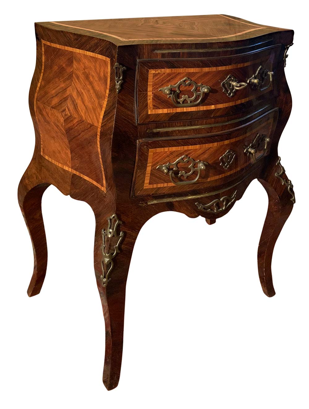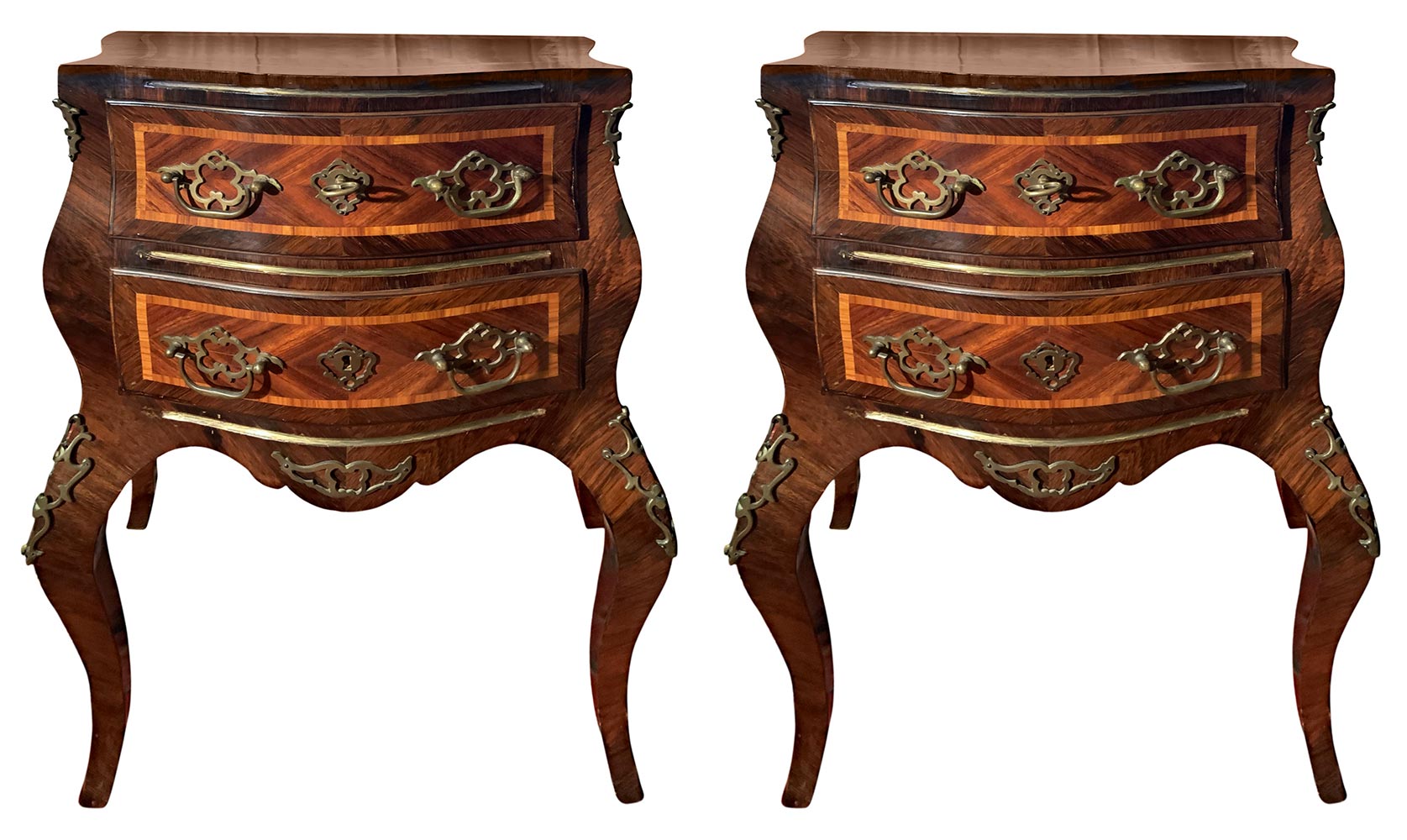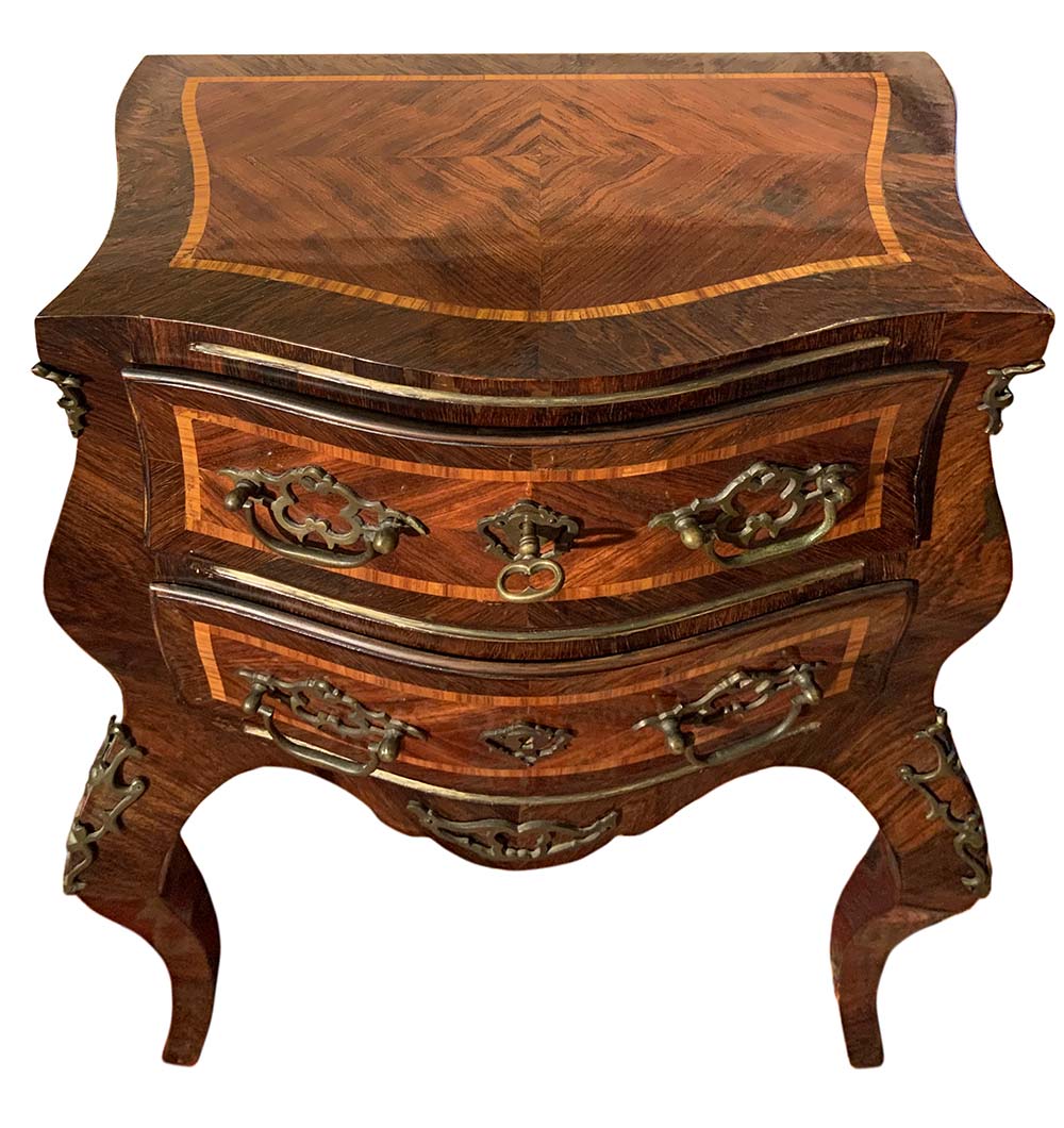Coppia comodini, Sicilia, fine XIX secolo. In palissandro e frese in legno di rosa. Mossi sul fronte e sui laterali. H cm 77x55x34.