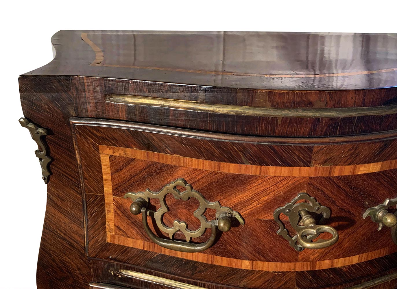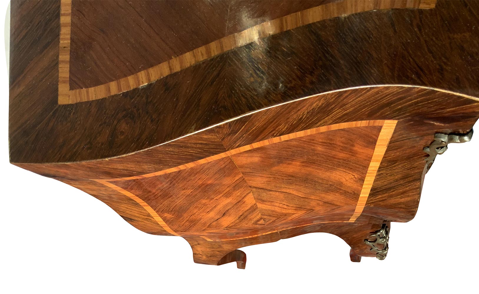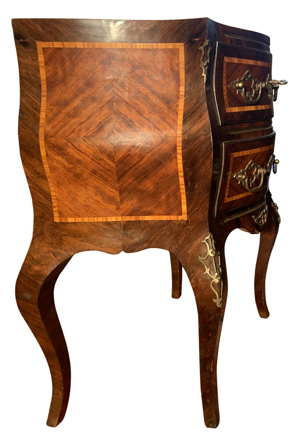 Coppia comodini, Sicilia, fine XIX secolo. In palissandro e frese in legno di rosa. Mossi sul fronte e sui laterali. H cm 77x55x34.
