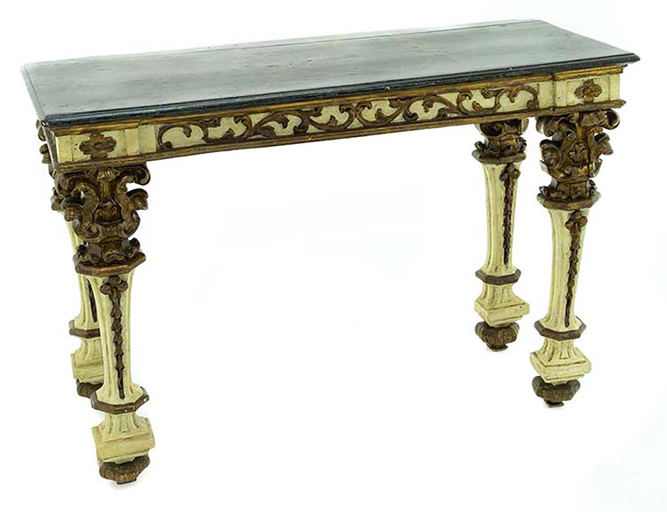 Consolle romana laccata e dorata, piano in finto marmo, XVIII Secolo. Cm 87X120X20. Restauri