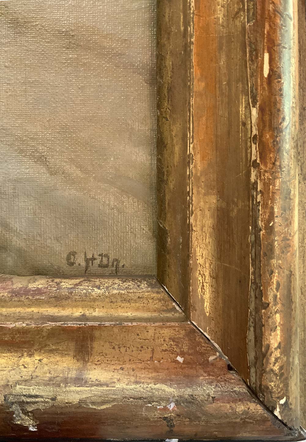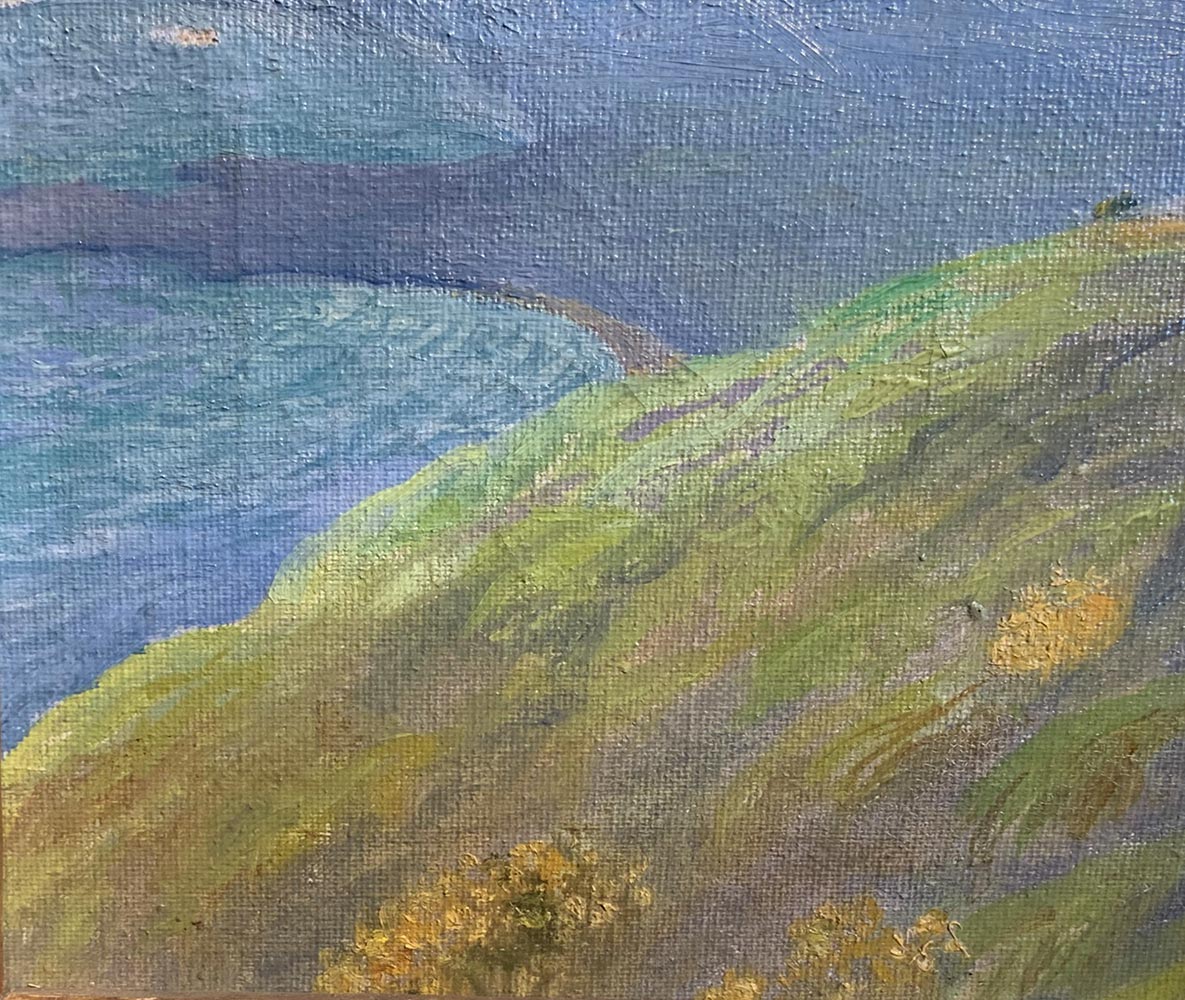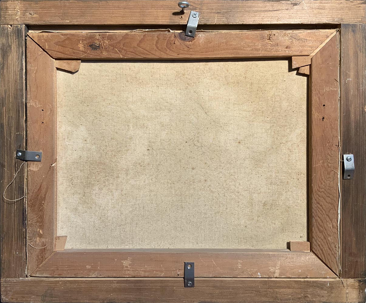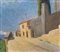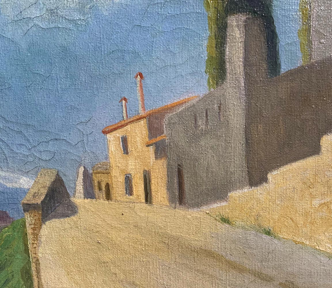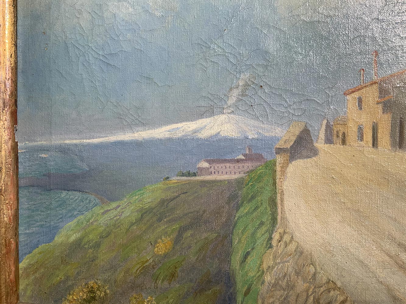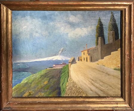 Pittore italiano degli inizi del XX secolo. Veduta dell'Etna da Taormina, via Pirandello. 40x49, olio su tela. Firmato con monogramma e datato 1932.