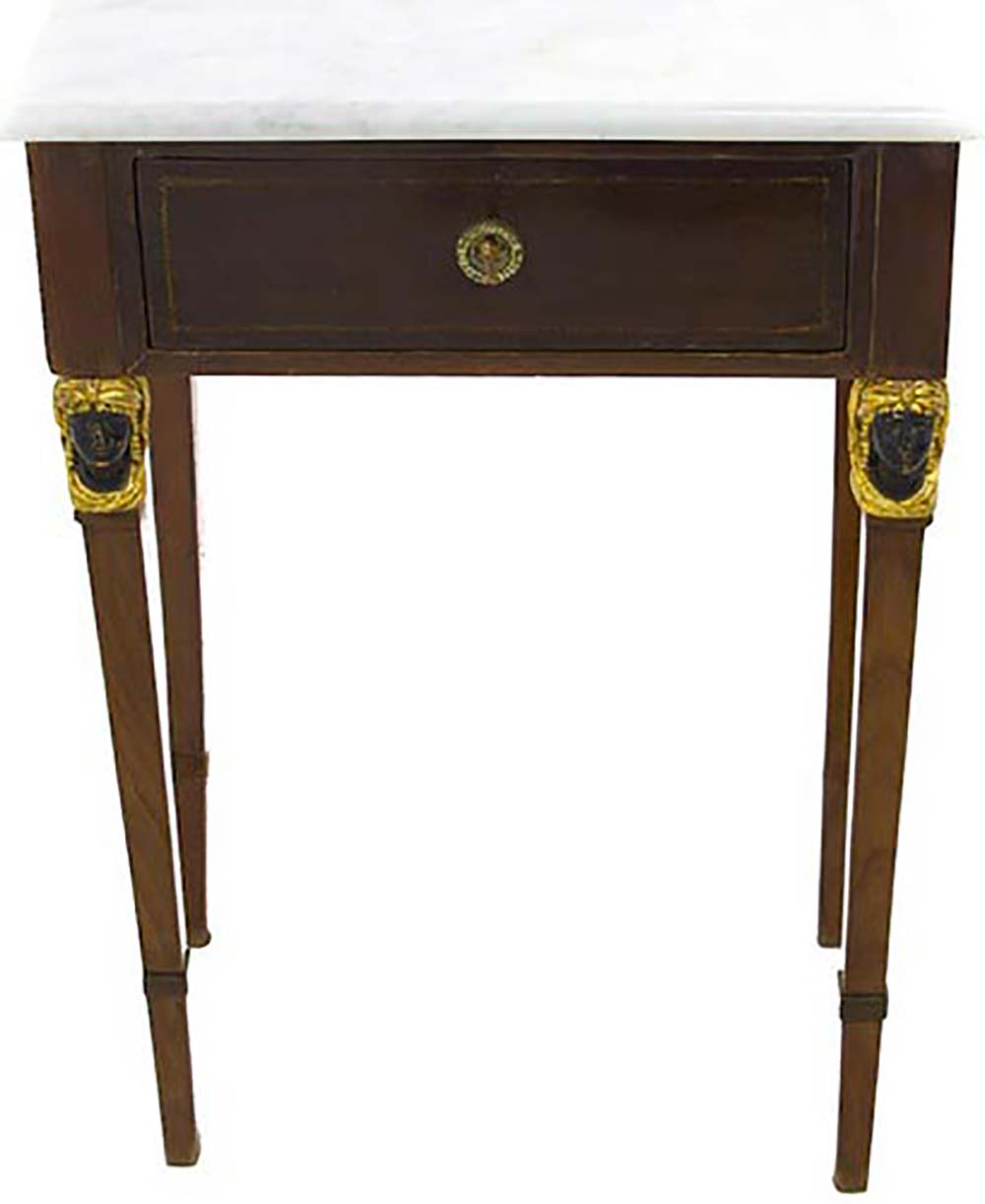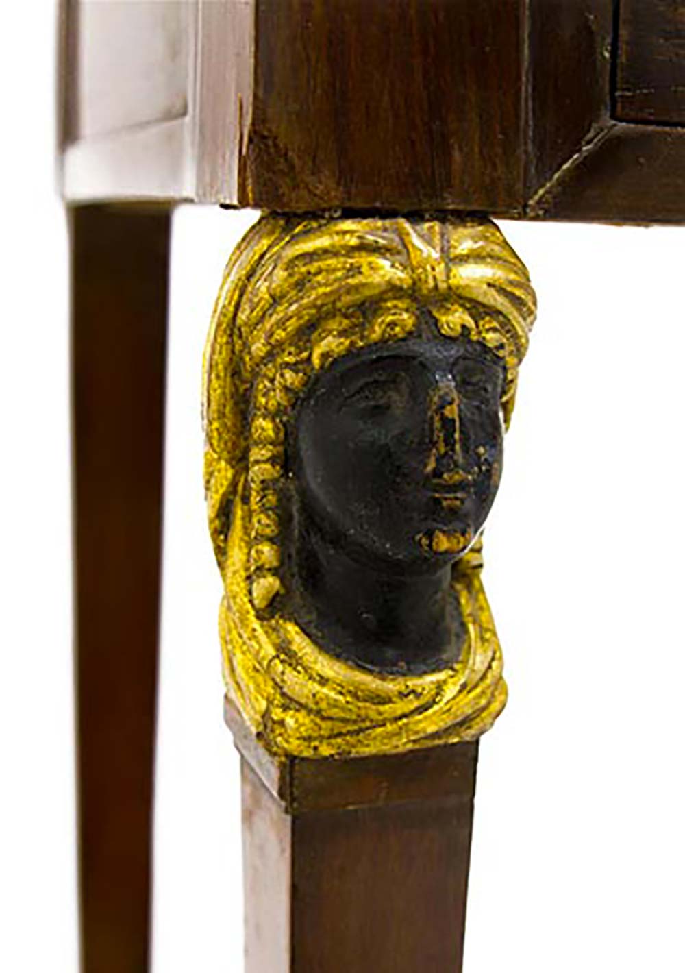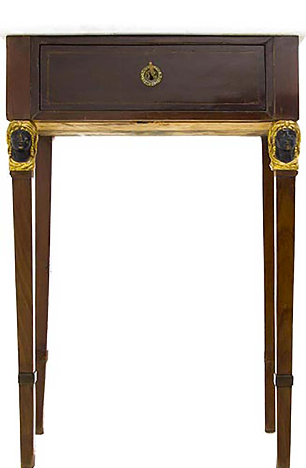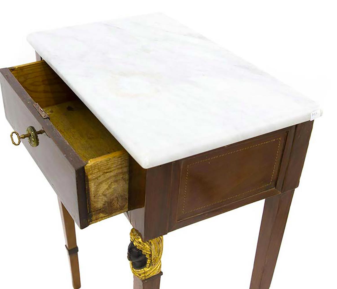 Tavolinetto Impero, ritorno d’Egitto, inizi XIX secolo. Cassetto centrale sotto, marmo bianco al pianono. H cm 80x55x33