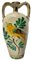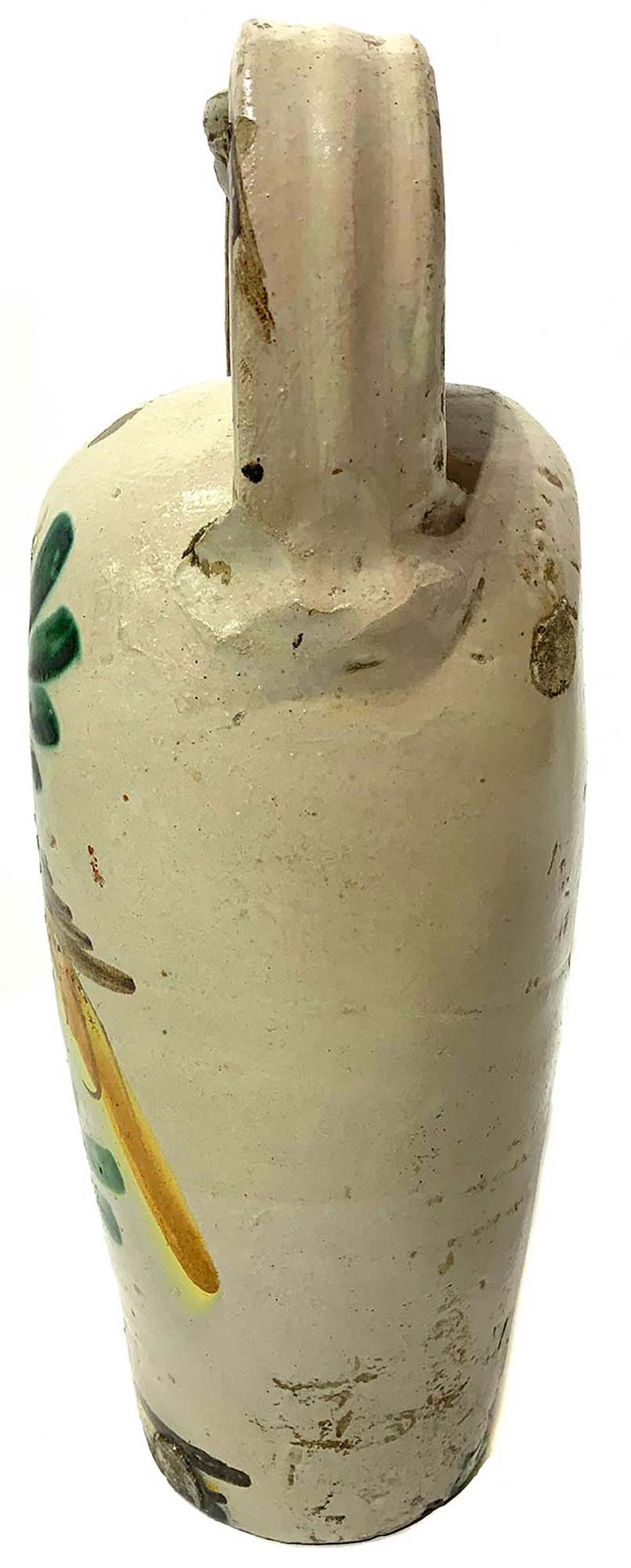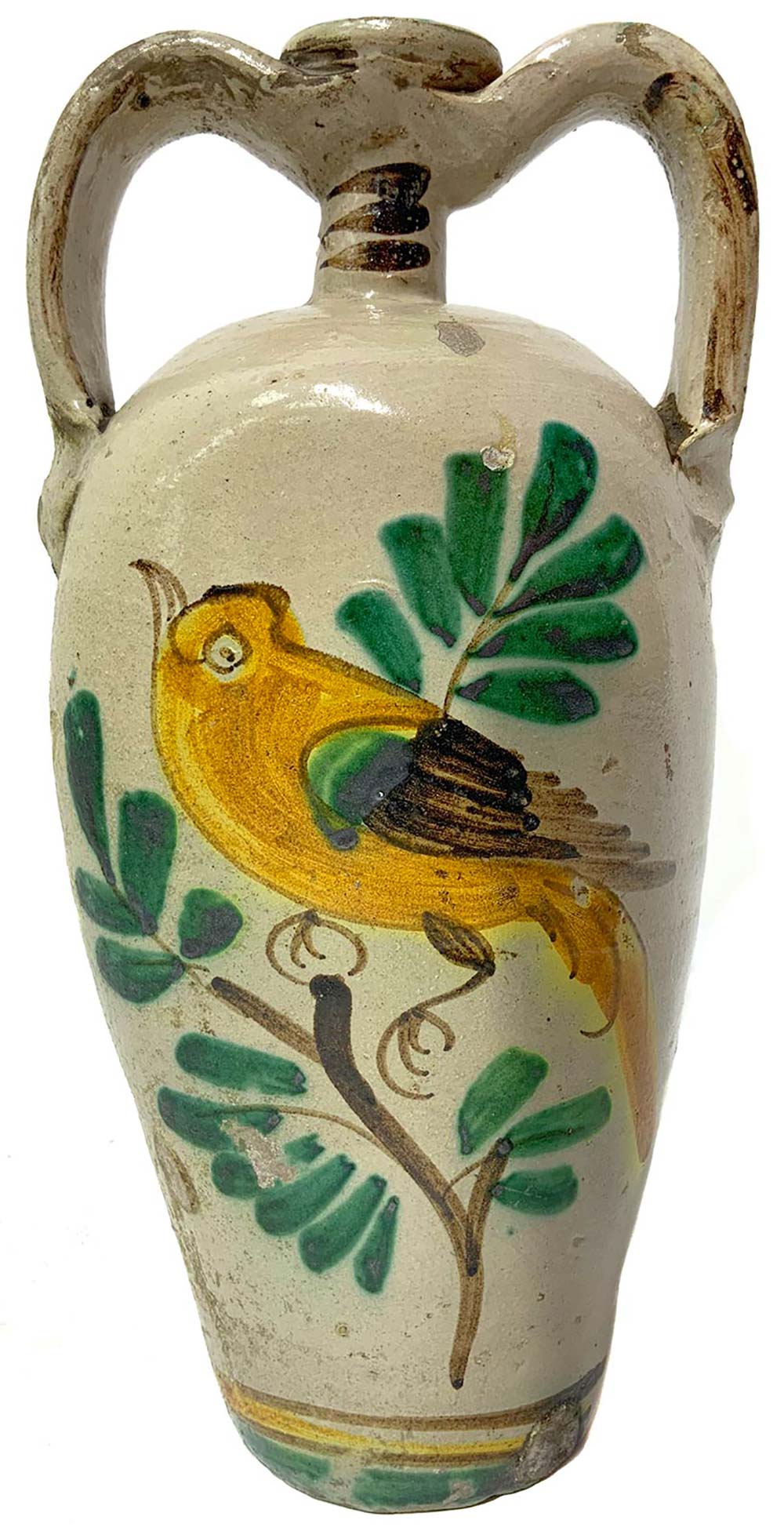 Quartara biansata in maiolica di Caltagirone, inizi XIX secolo. Su fondo bianco con decoro di uccello. H cm 34x17.