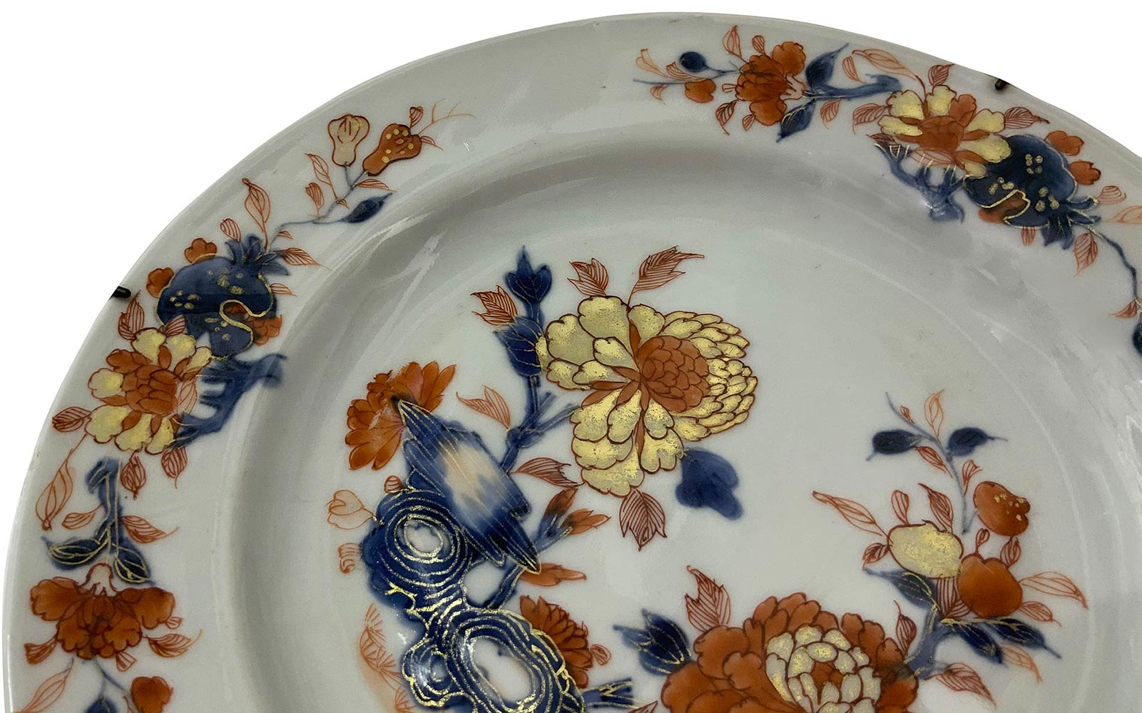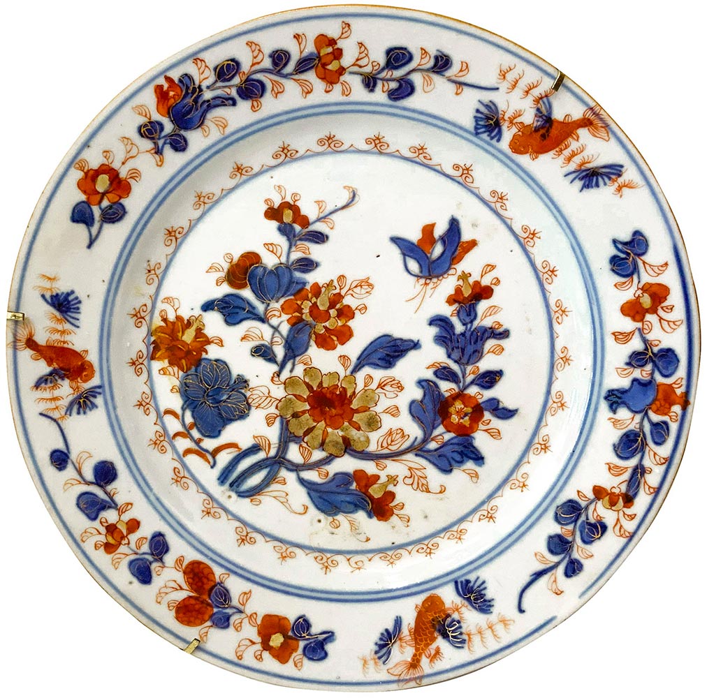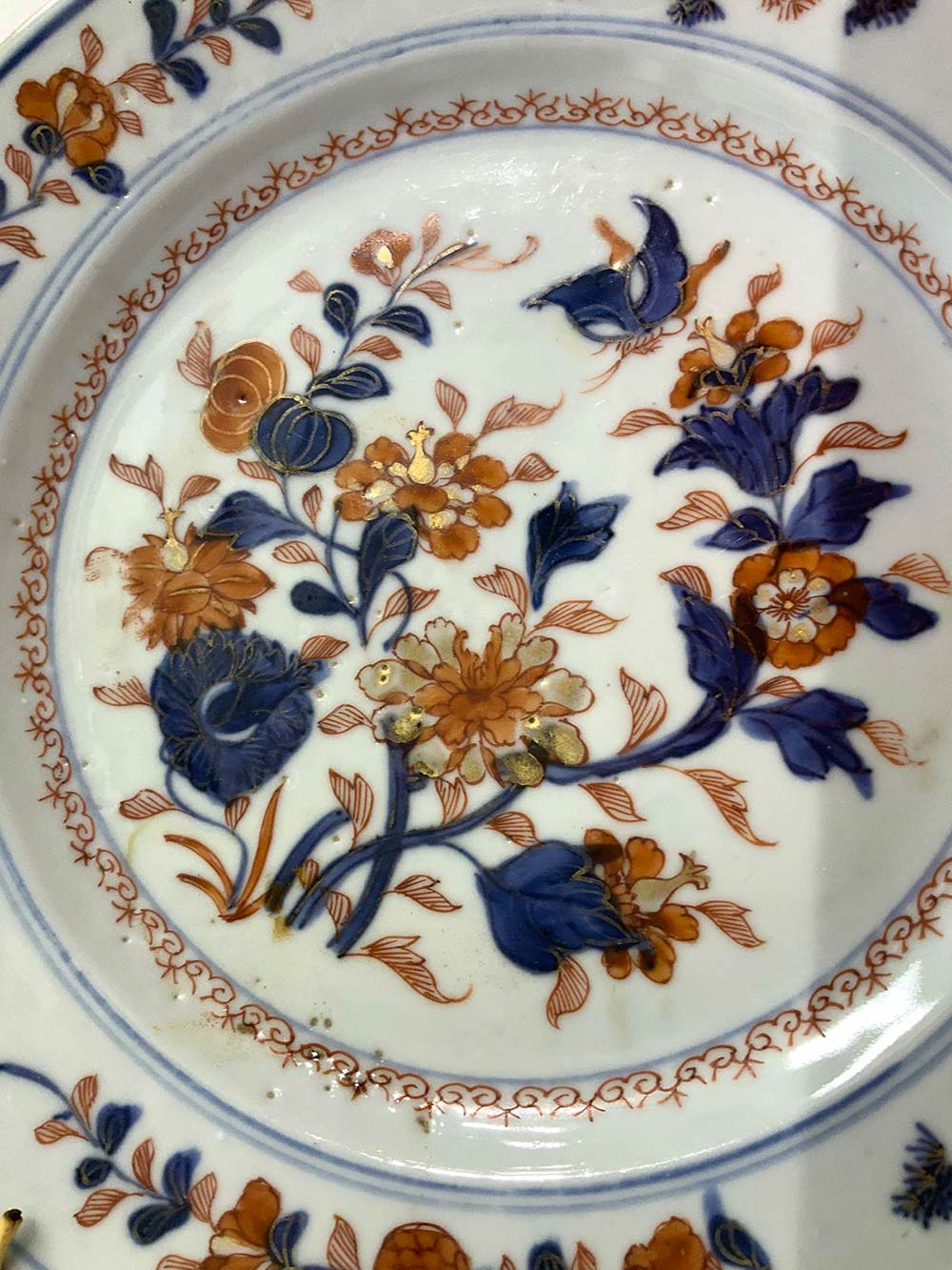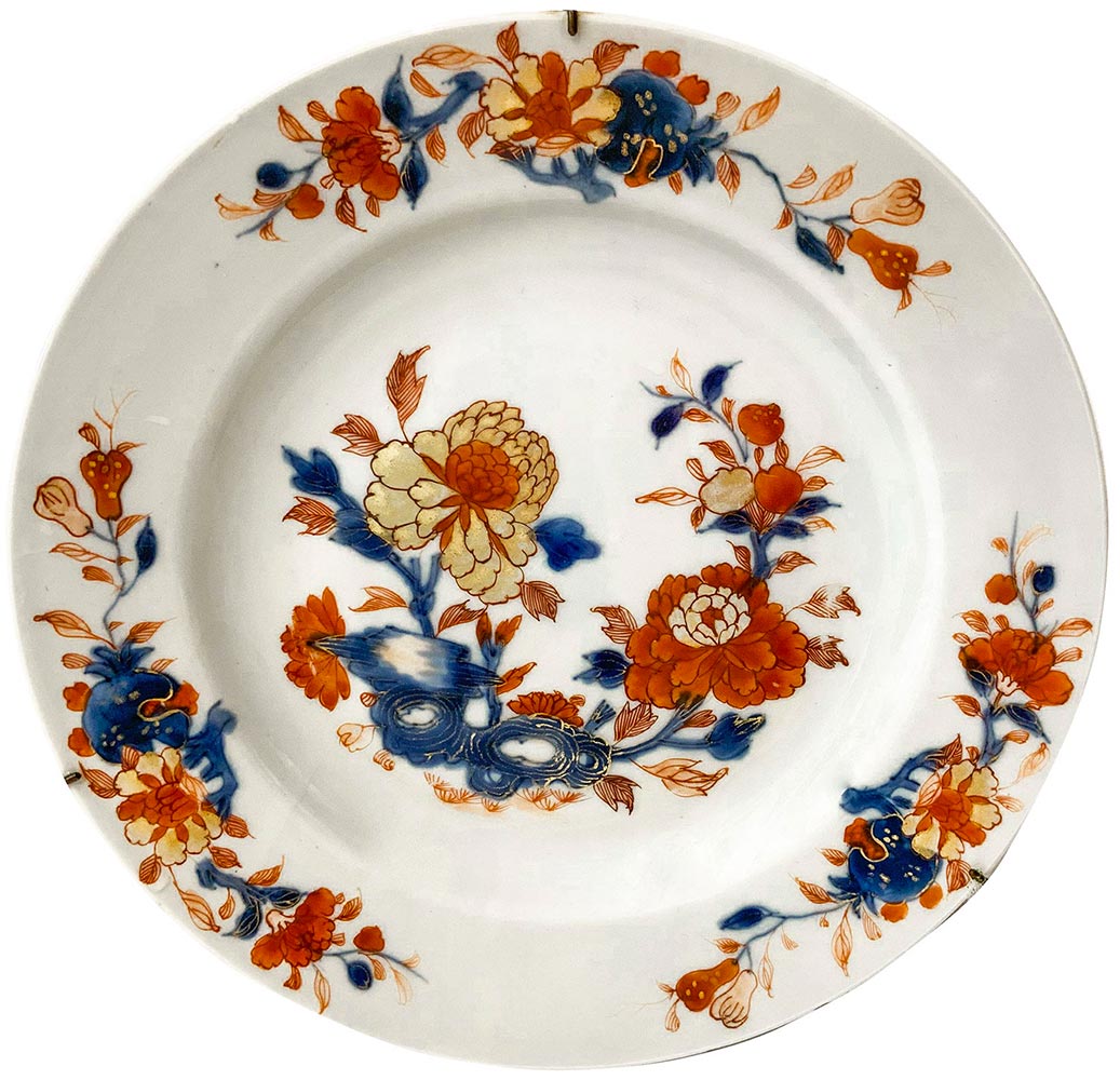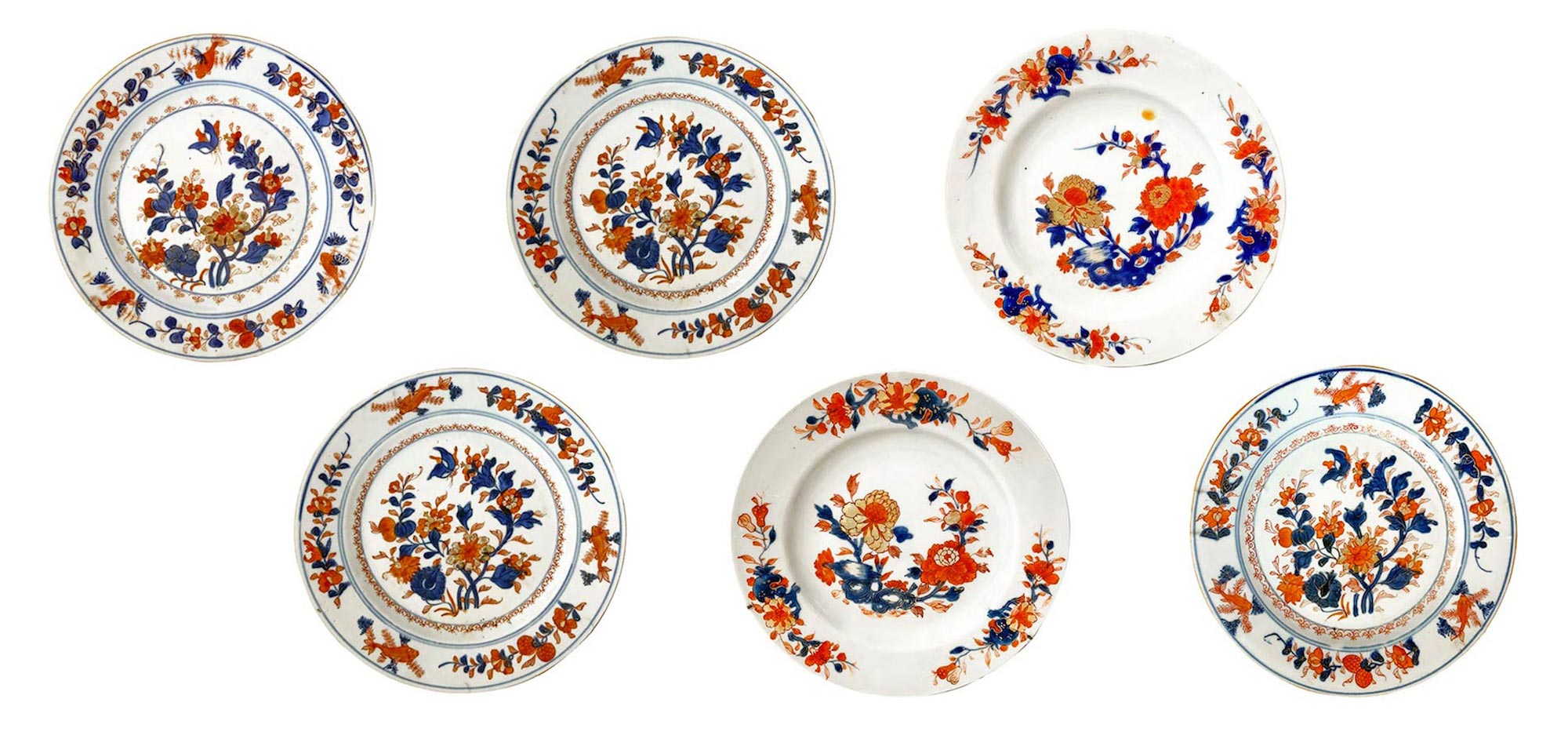 6 antichi piatti da muro in porcellana, manifattura Felice Clerici o Pasquale Rubati, Milano 1770 circa , con decoro ""alla peonia"" Imari. Diametro Cm 23. (sbeccatura in un piatto)"