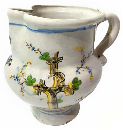 Versatoio in ceramica di Albisola, marchio lanterna, XVIII secolo, decorato con figura di donna. H cm 16.