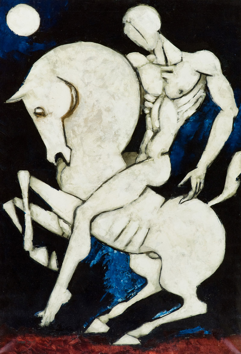 Bruno Landi Il cavaliere, 2001 Olio su tela, cm. 100x70 Firmato in basso a sinistra. Sul verso: scritto di Autenticità dell'Artista. Autentica dell'Archivio Generale su foto, con firma dell'Artista e Archivio n° 0407 - 2001.