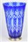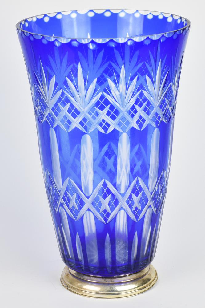 VASO IN VETRO BLU molato con motivi geometrici su base in metallo argentato...