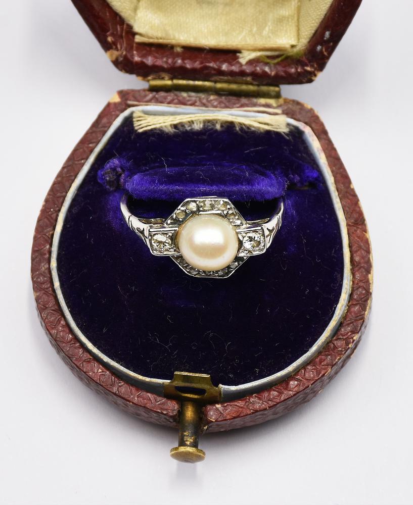 ANELLO IN ORO BIANCO 18 K CON PERLA E PICCOLI BRILLANTI entro astuccio...