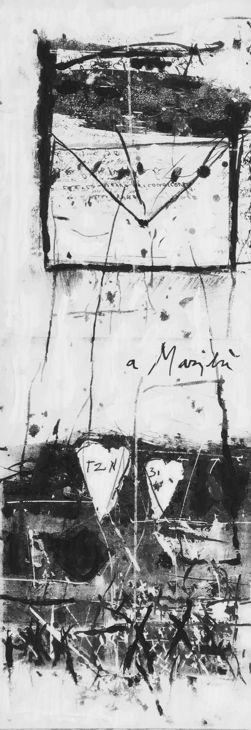 Giorgio Celiberti A Marilù Tecnica mista su carta applicata su tavola, cm. 80x32 Titolo al centro. Sul verso: firma e titolo; Etichetta "Sogno lontano" 13 Artisti a Cento, nel segno della memoria, Rocca di Cento, Ferrara, Maggio - Agosto, 2008; Etichetta "Expo Pittura senza colore, Comune di Pietrasanta, 18 Agosto - 1 Settembre 2009". Autentica dell'Artista su foto. Esposizione: "Sogno lontano" 13 Artisti a Cento, nel segno della memoria, Rocca di Cento, Ferrara, Maggio - Agosto, 2008, pubblicato in copertina.