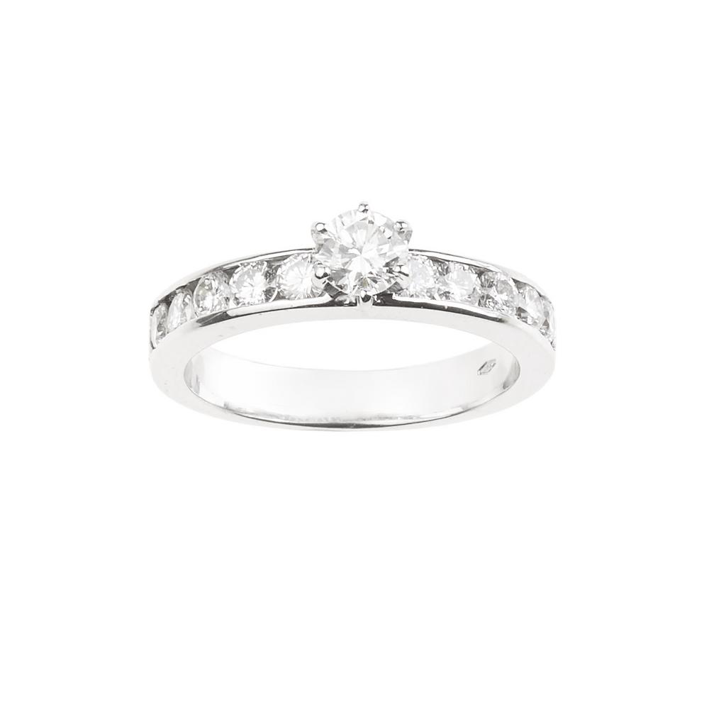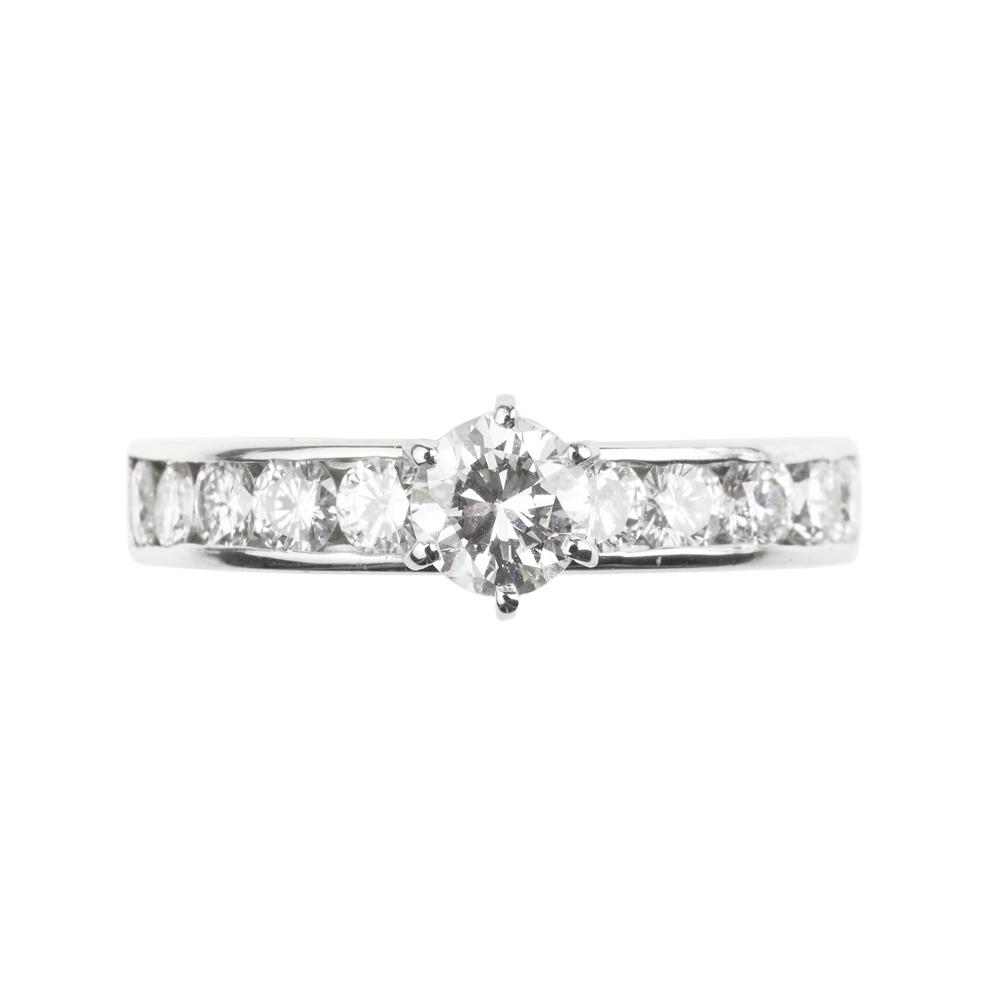 al centro un diamante di forma rotonda a brillante di ct 0.52 circa, colore G, purezza VS2, impreziosito ai lati da dieci diamanti per ct 1 totali circa, punzone 750, mis 20, g 6,3