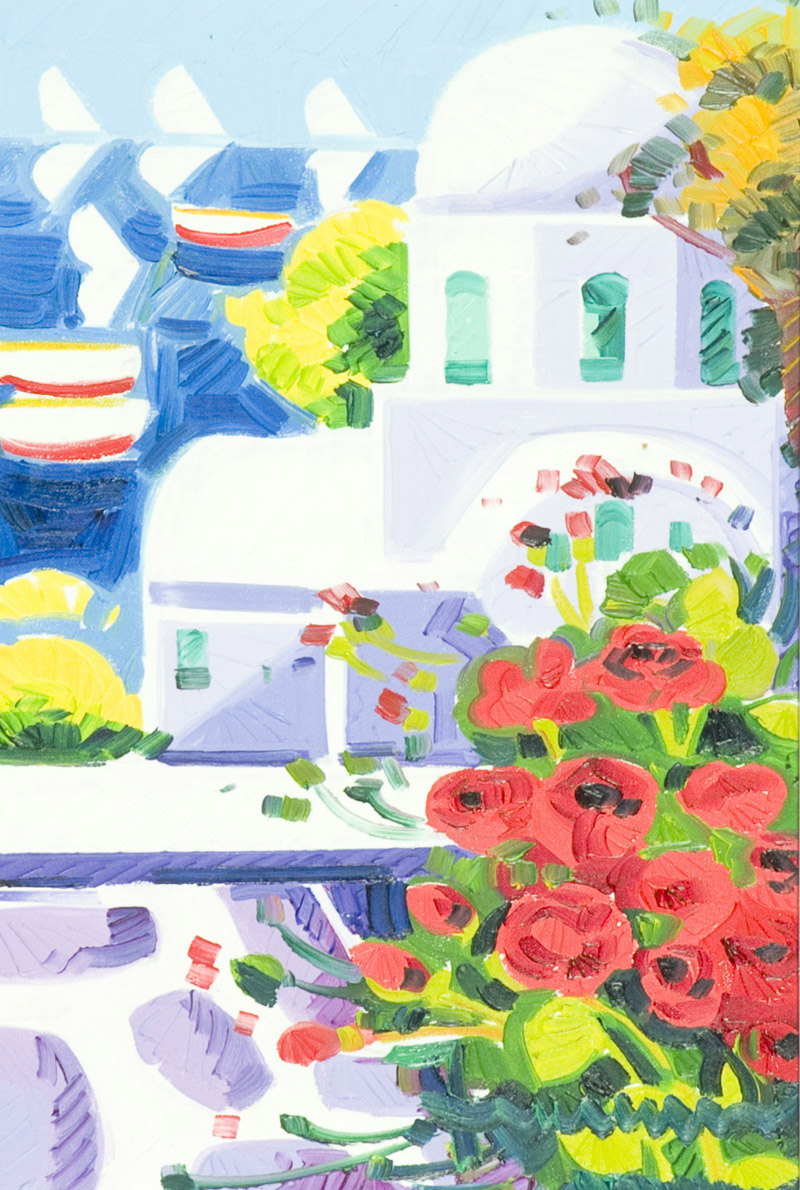 Athos Faccincani Santorini e rose rosse, 2012 Olio su tela, cm. 30x20 Firmato in basso a destra. Sul verso: firma e titolo.
