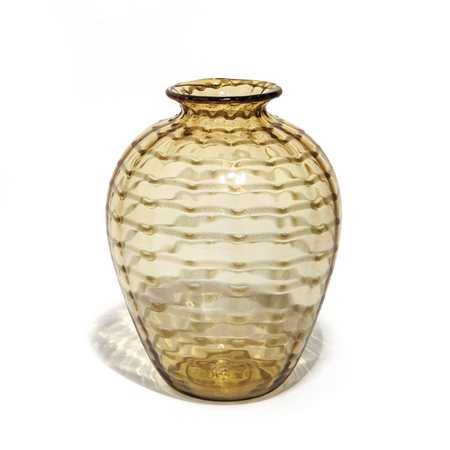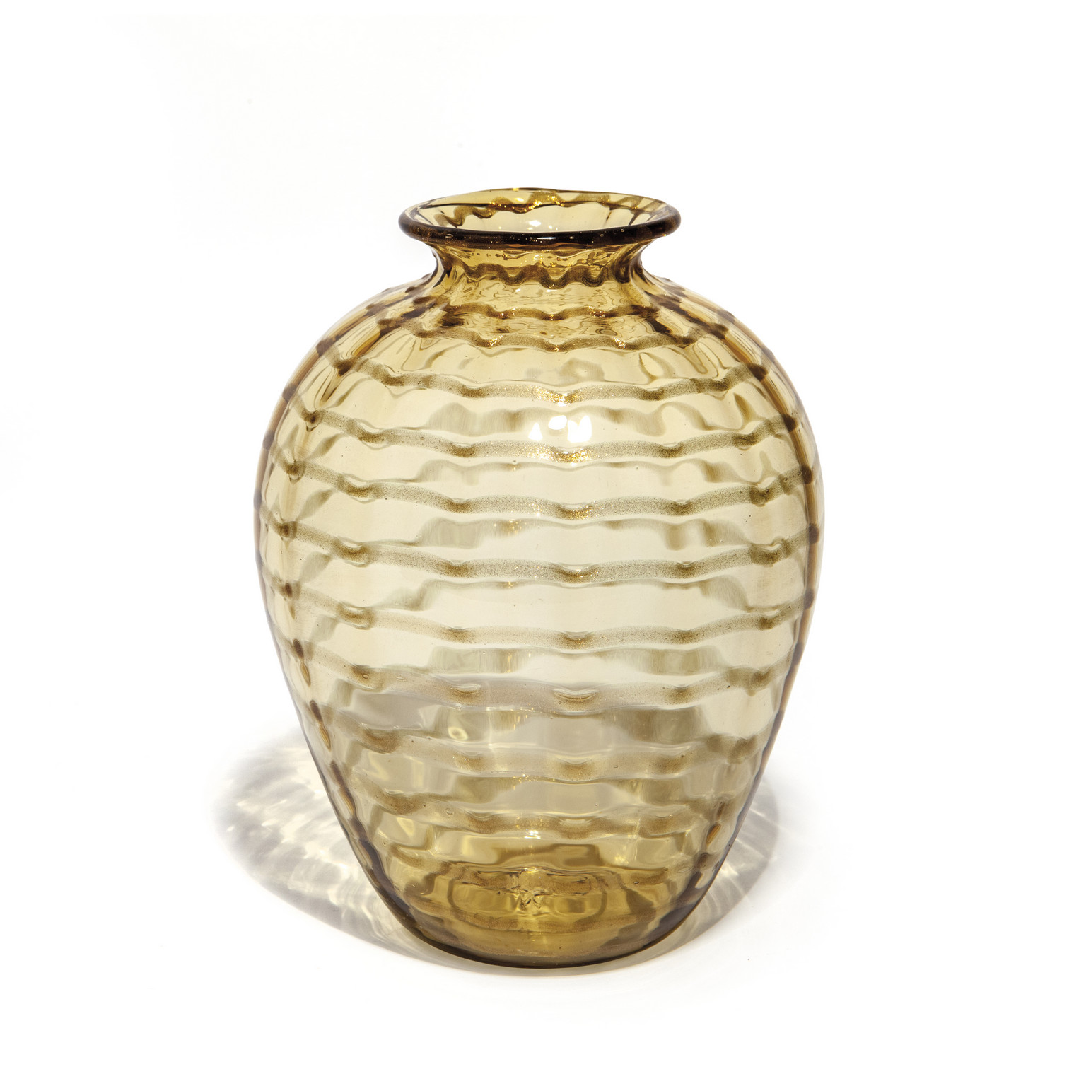 Un vaso in vetro ambrato costolato con spirale di avventurina 1936.