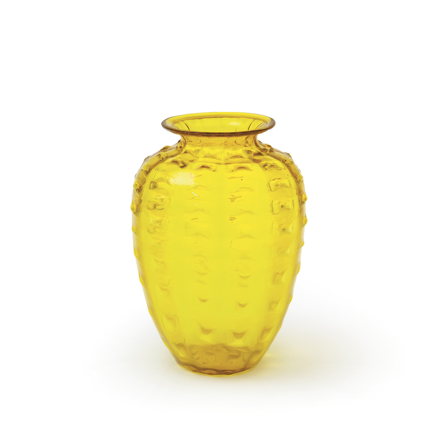 Un vaso in vetro soffiato giallo con applicazioni a spirale dello stesso colore circa 1930.