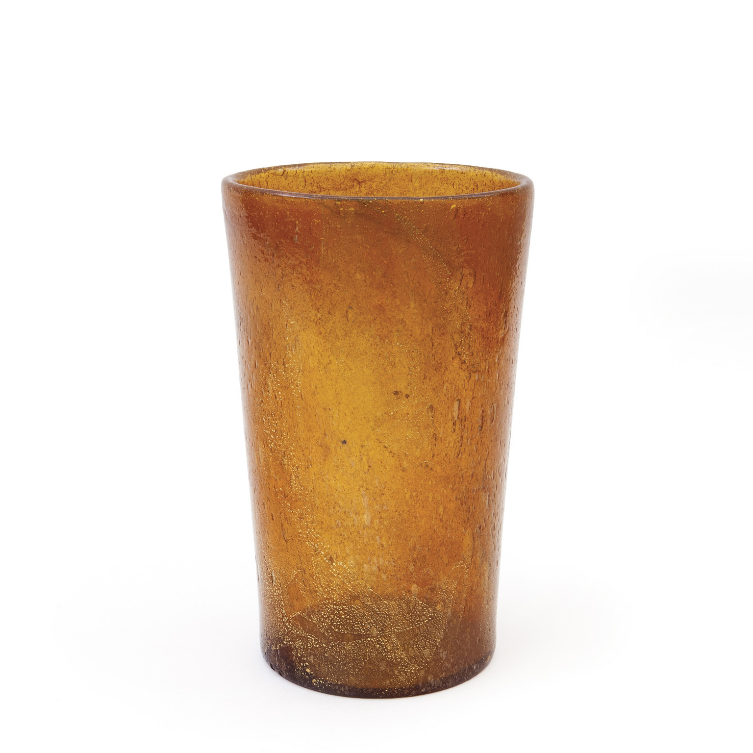 Un vaso in vetro pulegoso ambrato con foglia oro circa 1940.