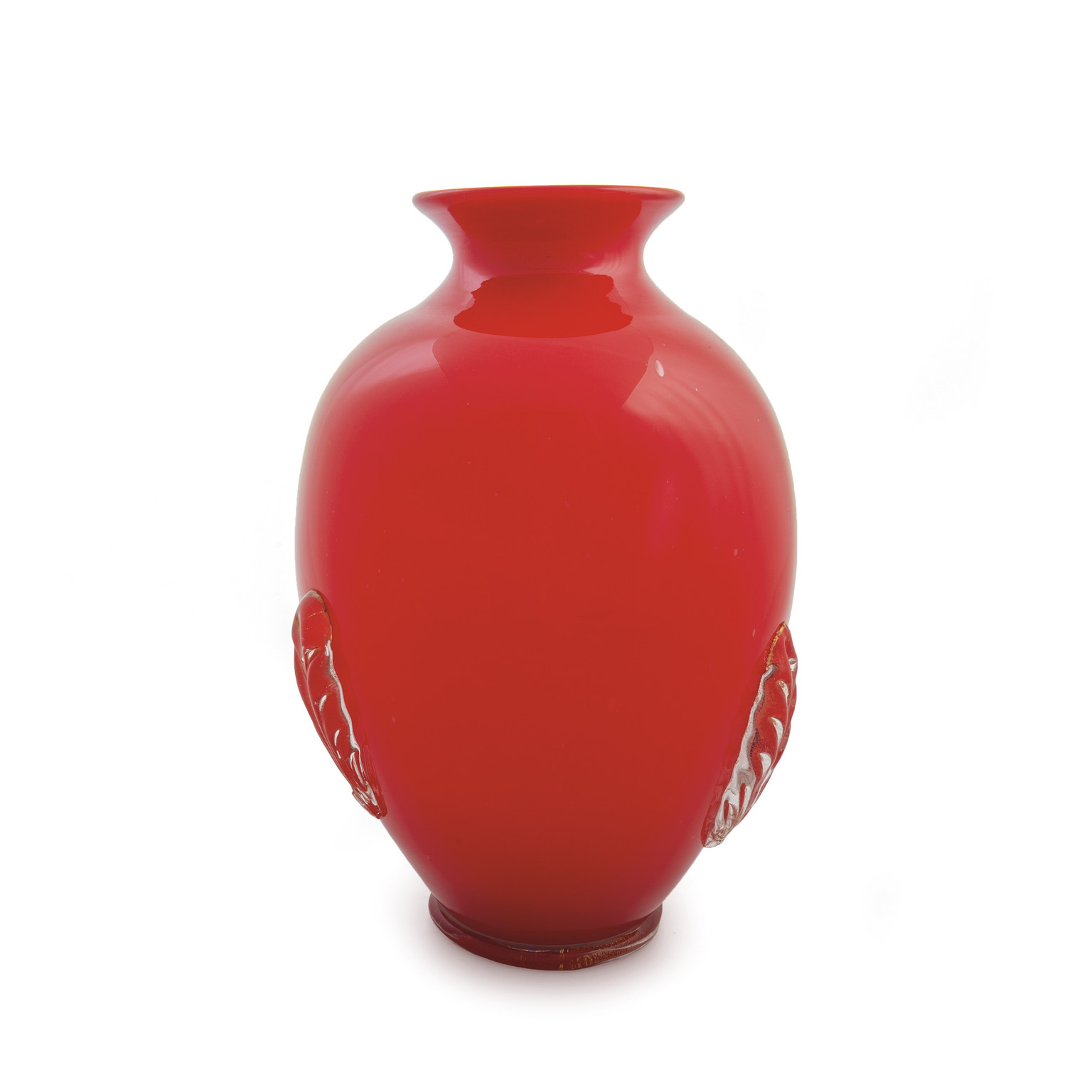 Un vaso in pasta vitrea rossa con applicazione di foglie in cristallo e foglia d'oro circa 1932.