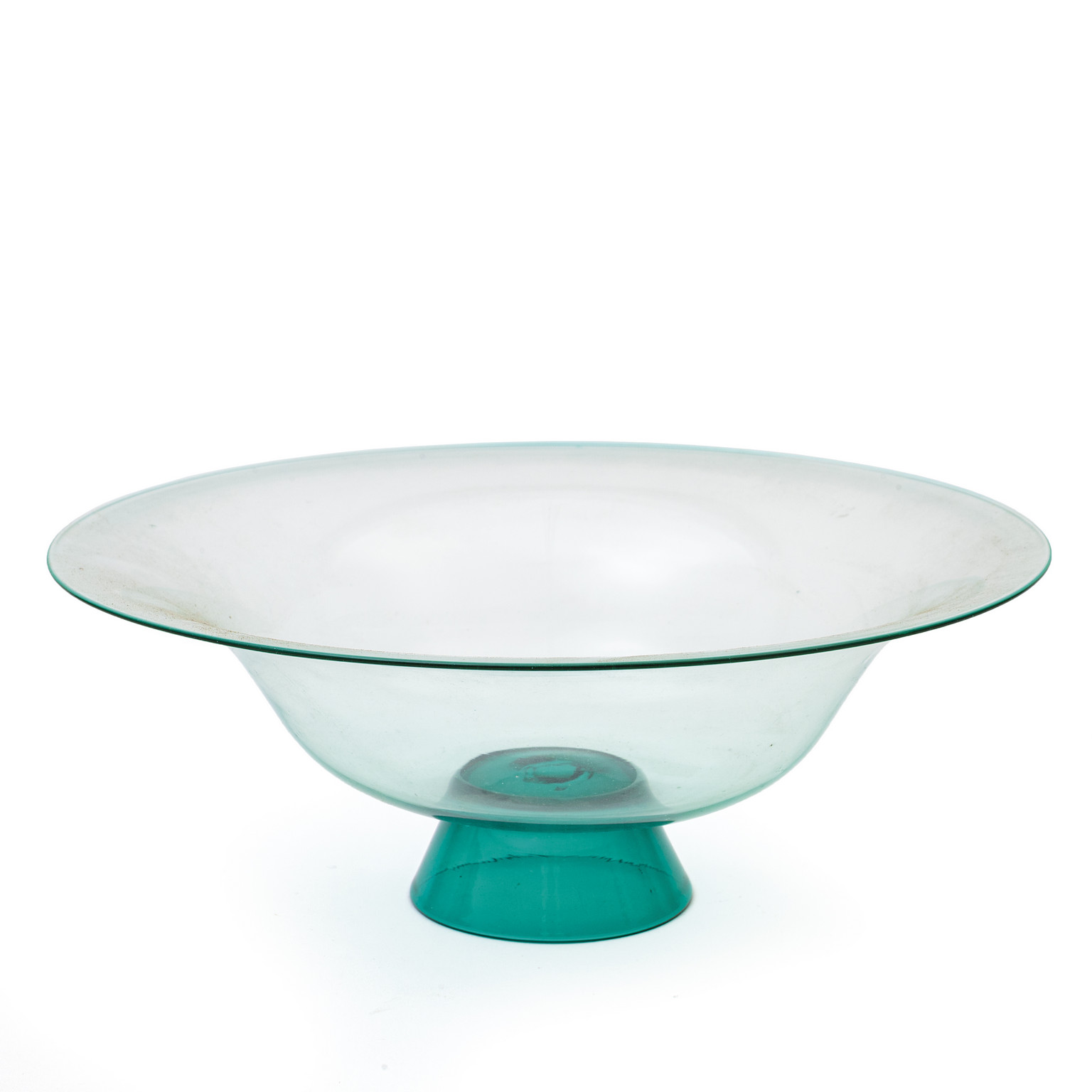 Una coppa in vetro trasparente verdino su piede conico verde circa 1930.