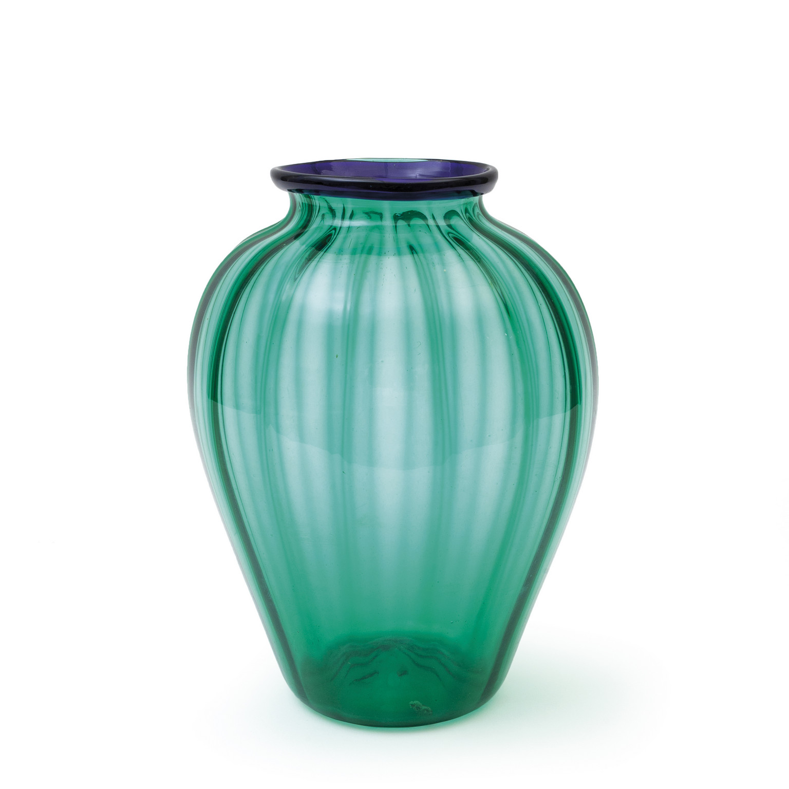 Un vaso costolato in vetro soffiato verde con bocca bordata di vetro blu circa 1930.