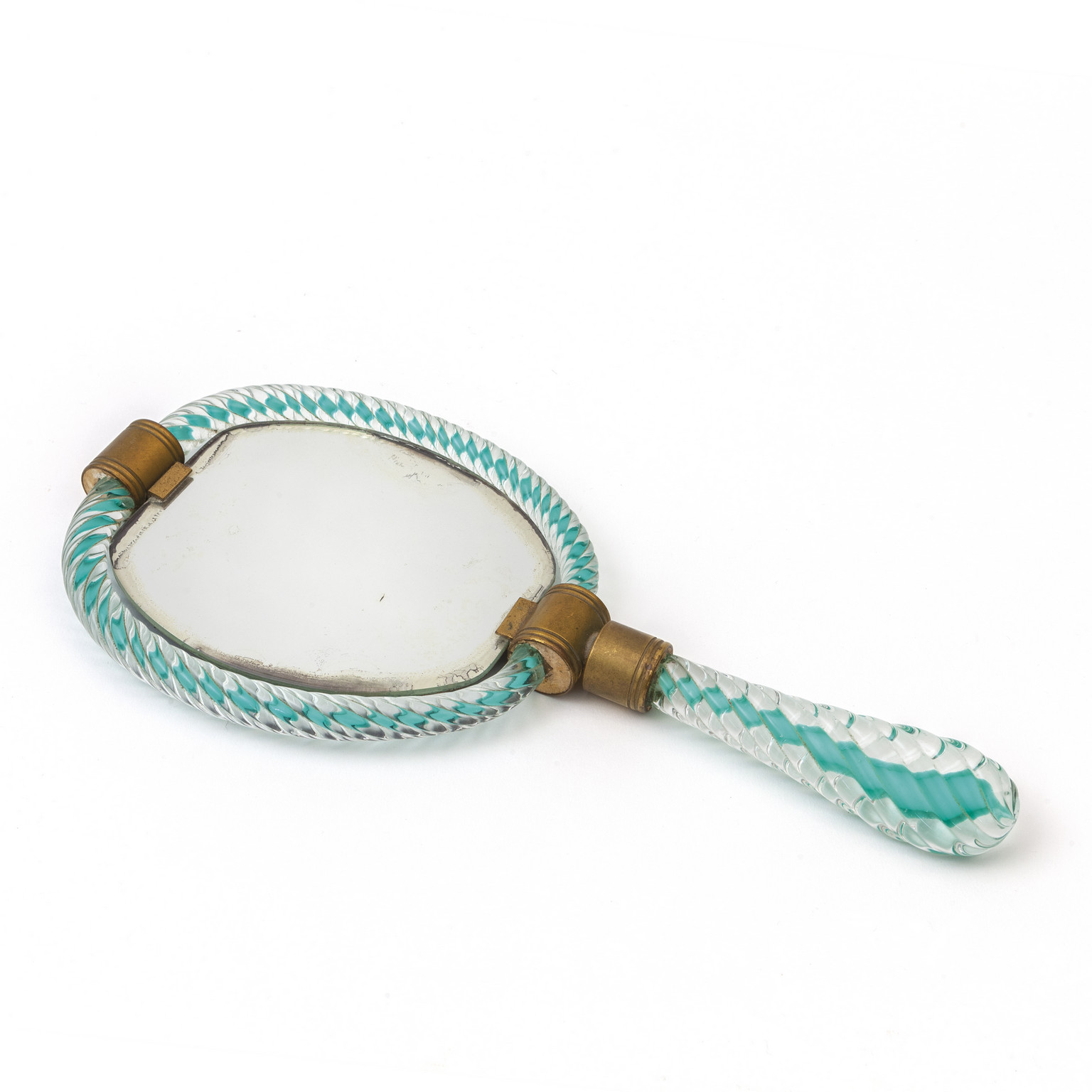 Uno specchio a mano in cristallo ritorto con sommersione turchese e ottone circa 1935.