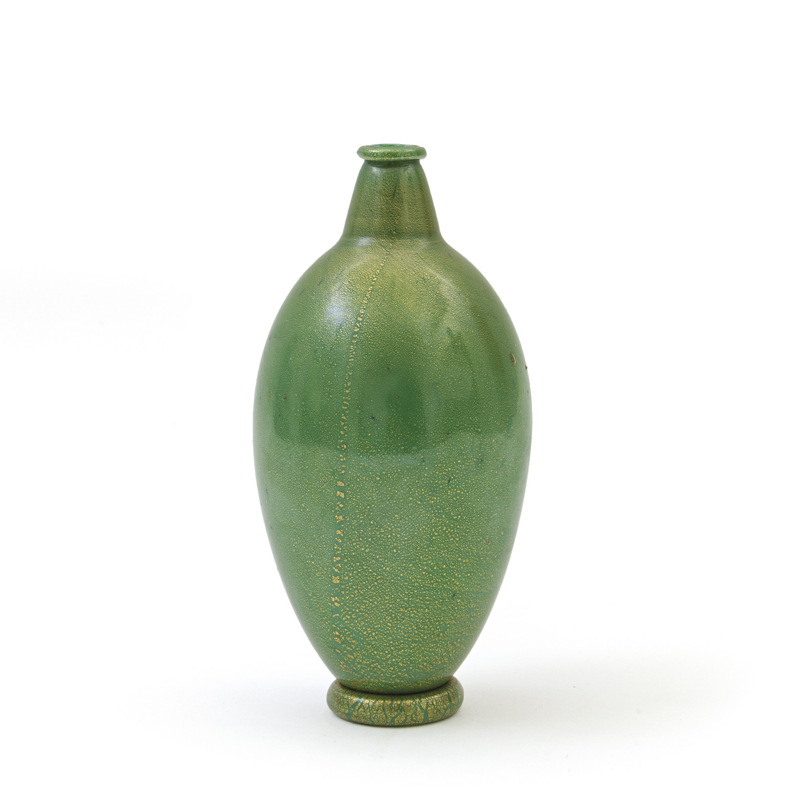 Un vaso in pasta vitrea verde e foglia d'oro modello '5920' circa 1929.