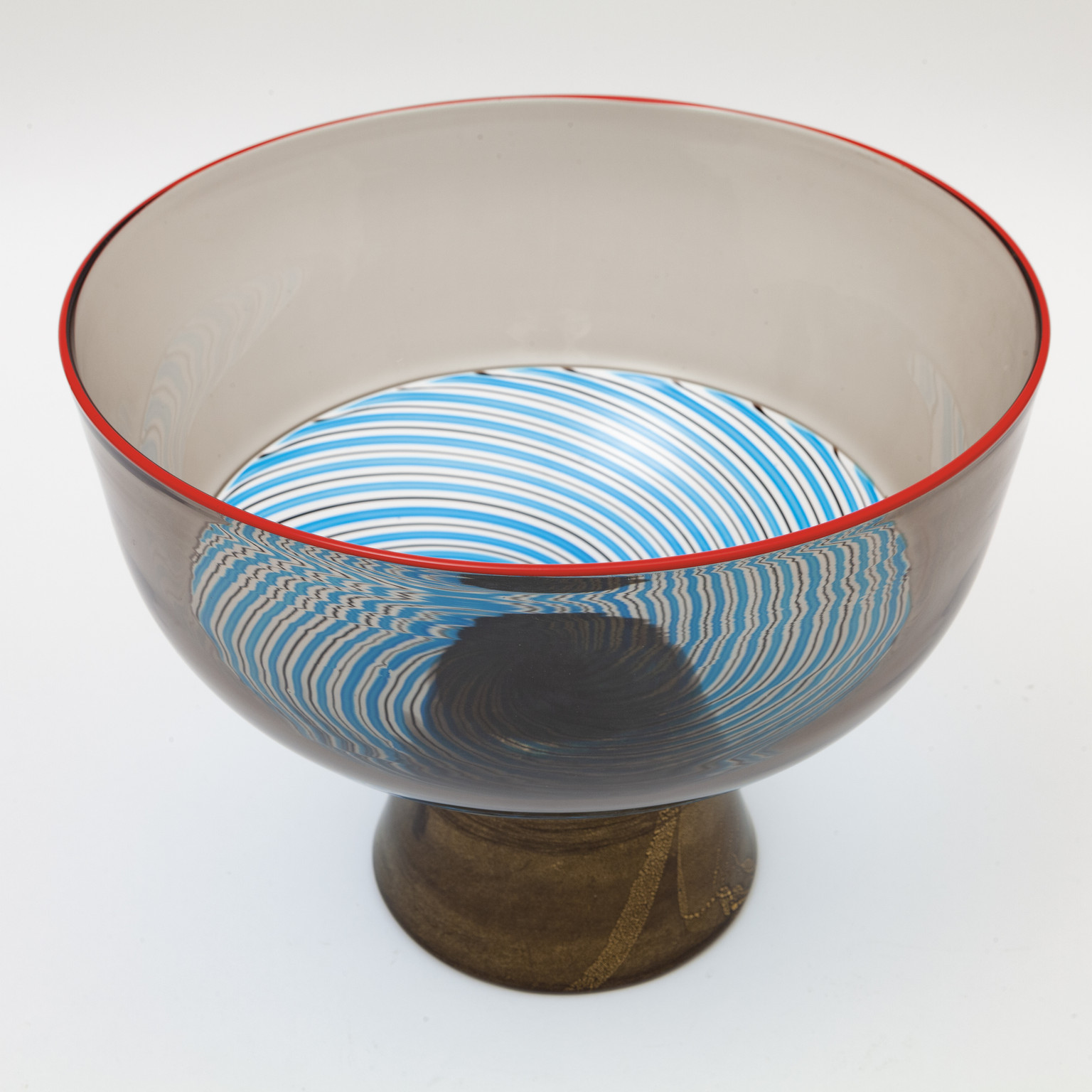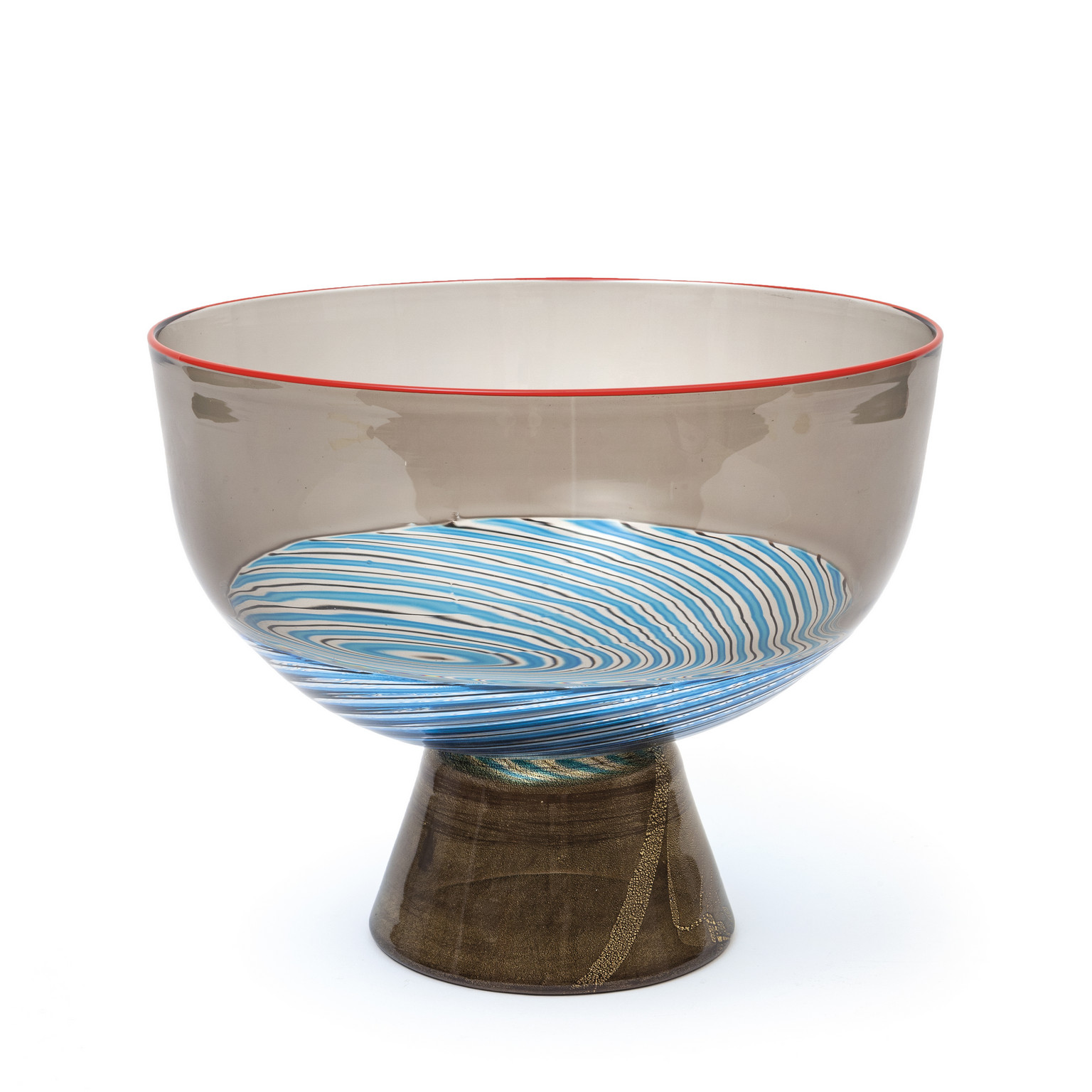 Una grande coppa con base nera e foglia d'oro canne ritorte e incalmo fumè con bordo in pasta vitrea corallo 1988.