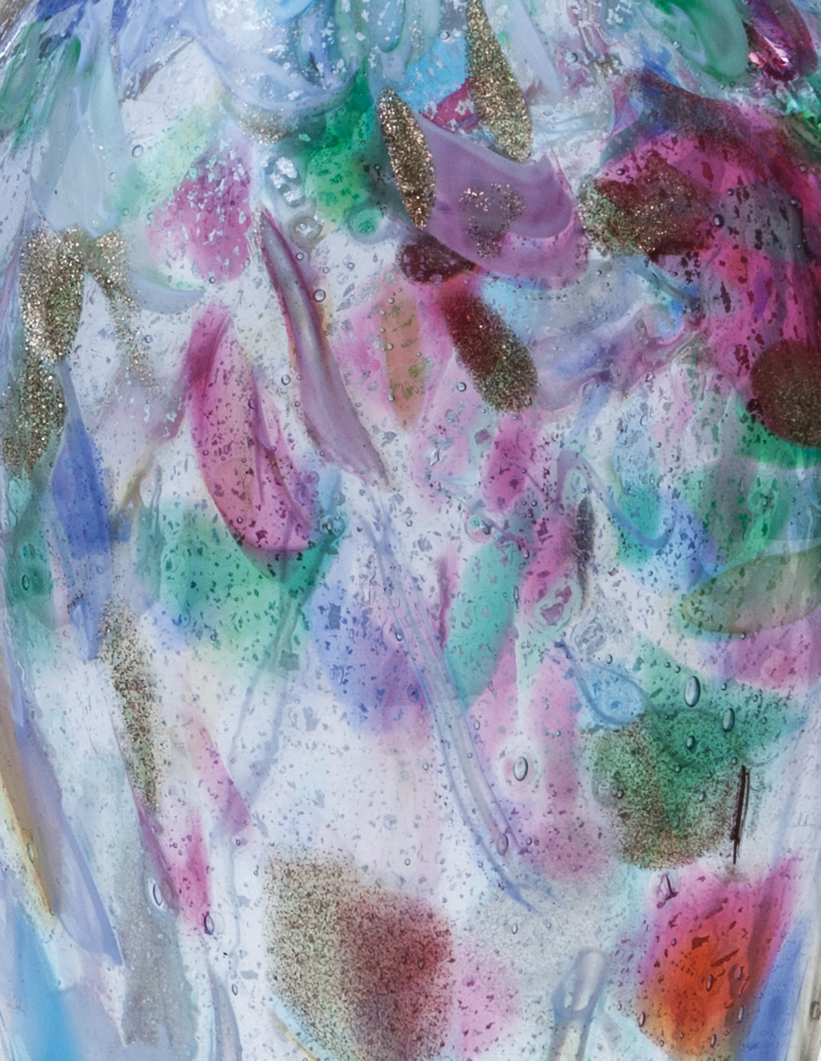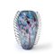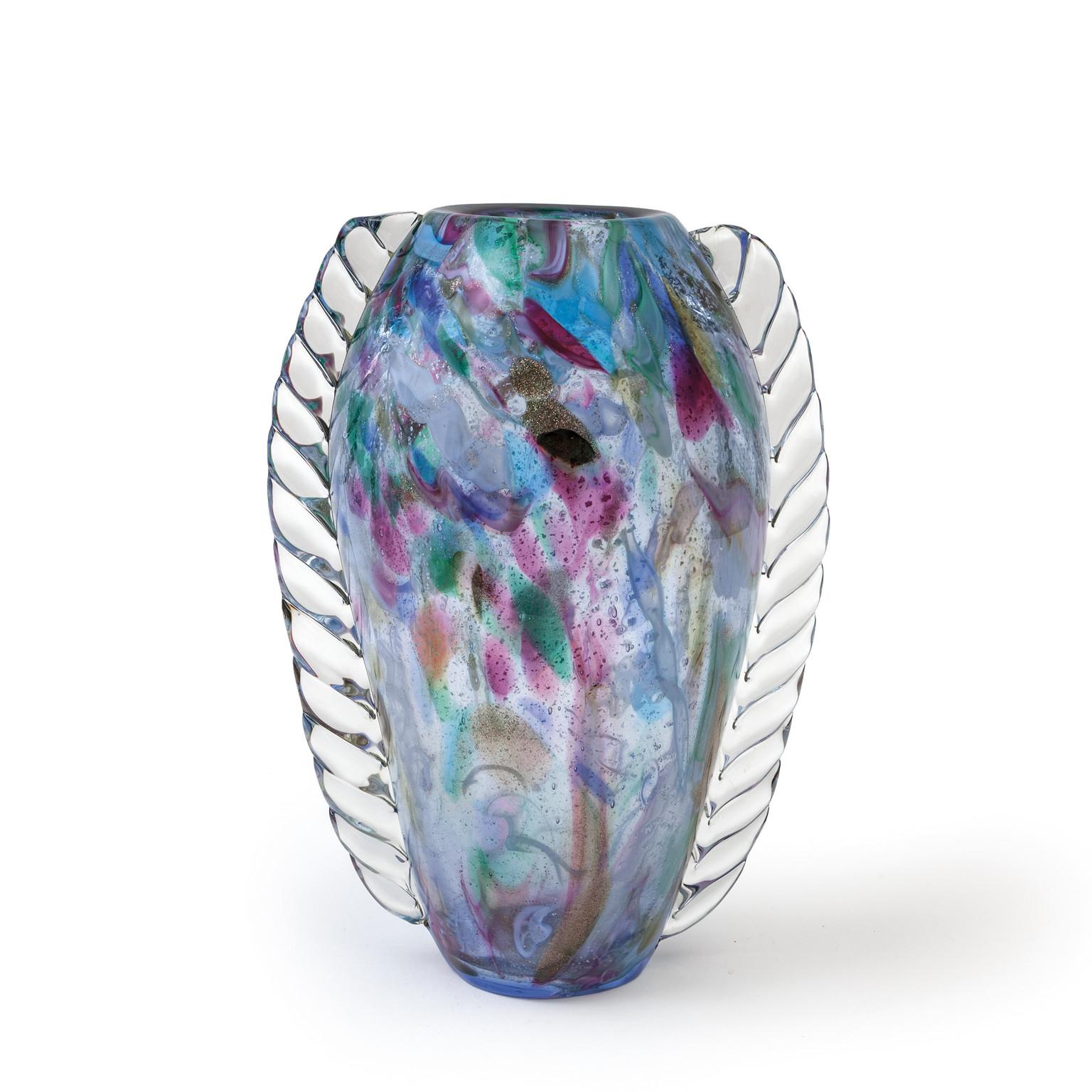 Un vaso a macchie colorate e foglia d'argento con morise laterali in cristallo circa 1950.