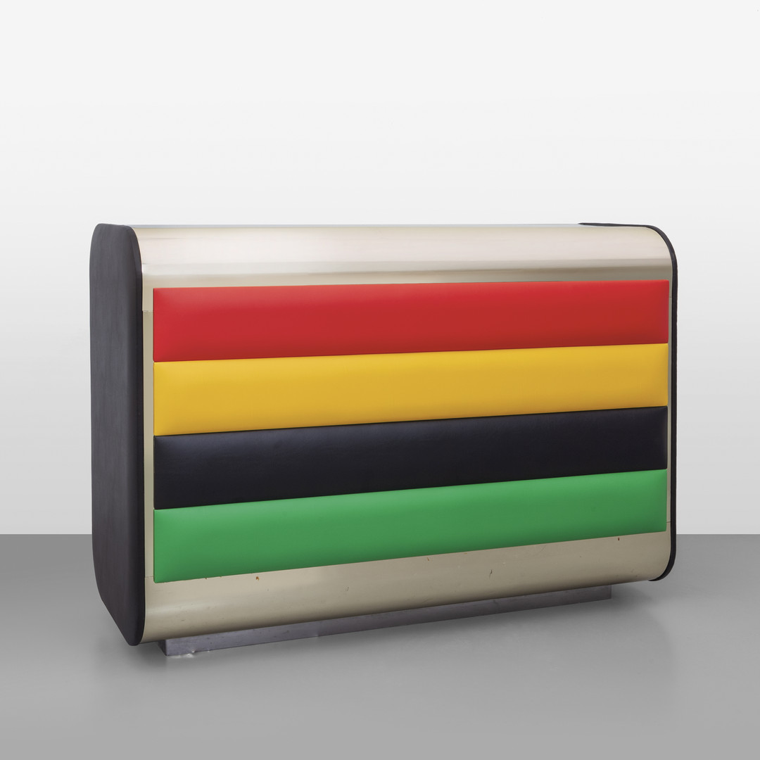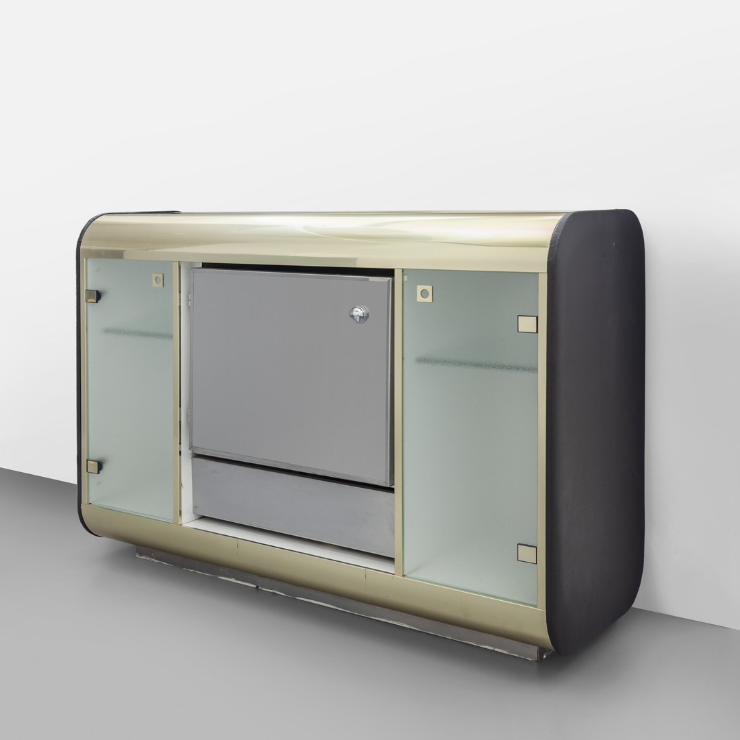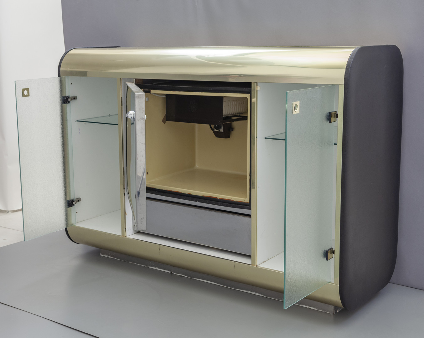 Brass mirrored coloured crystal moulded glass chrome-plated brass vinyl and a fridge compartment with a chrome-plated steel door.