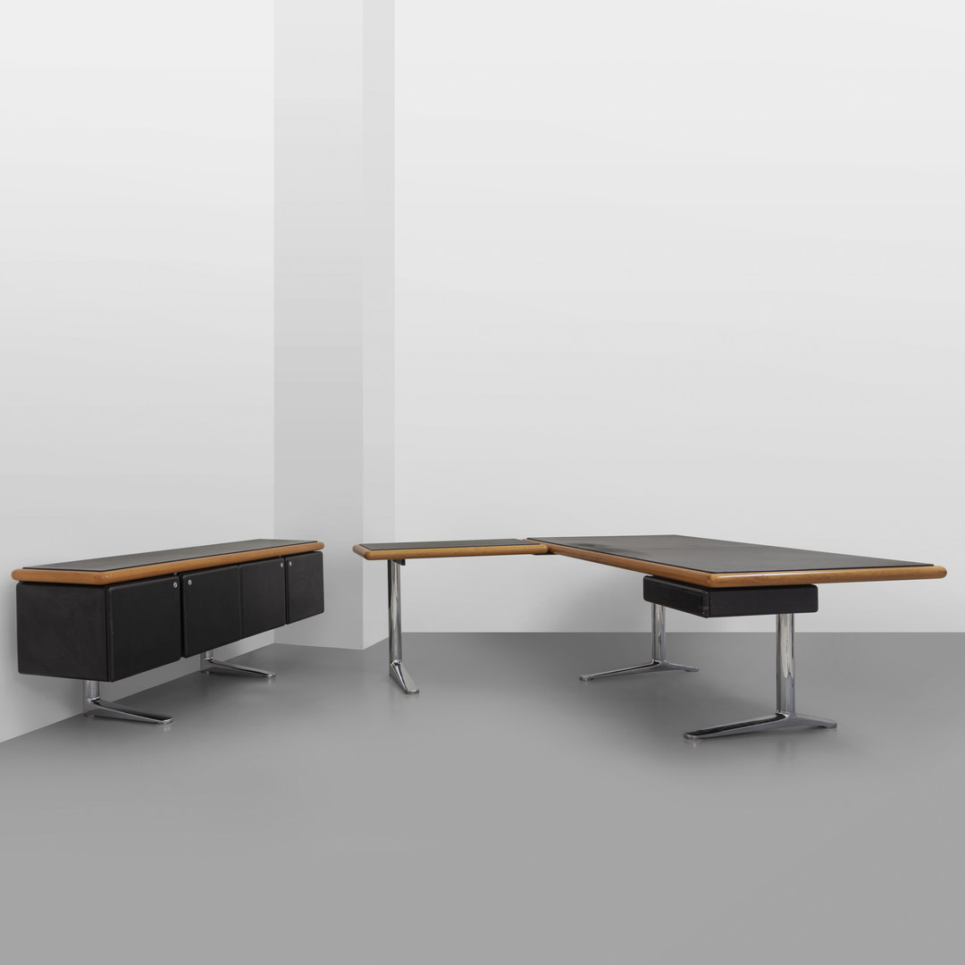A desk with a sideboard and an accessory table from the Executive Plattner Collection manufactured by KNOLL INTERNATIONAL 1973-1980.